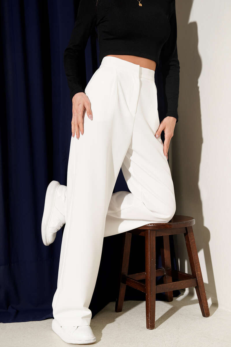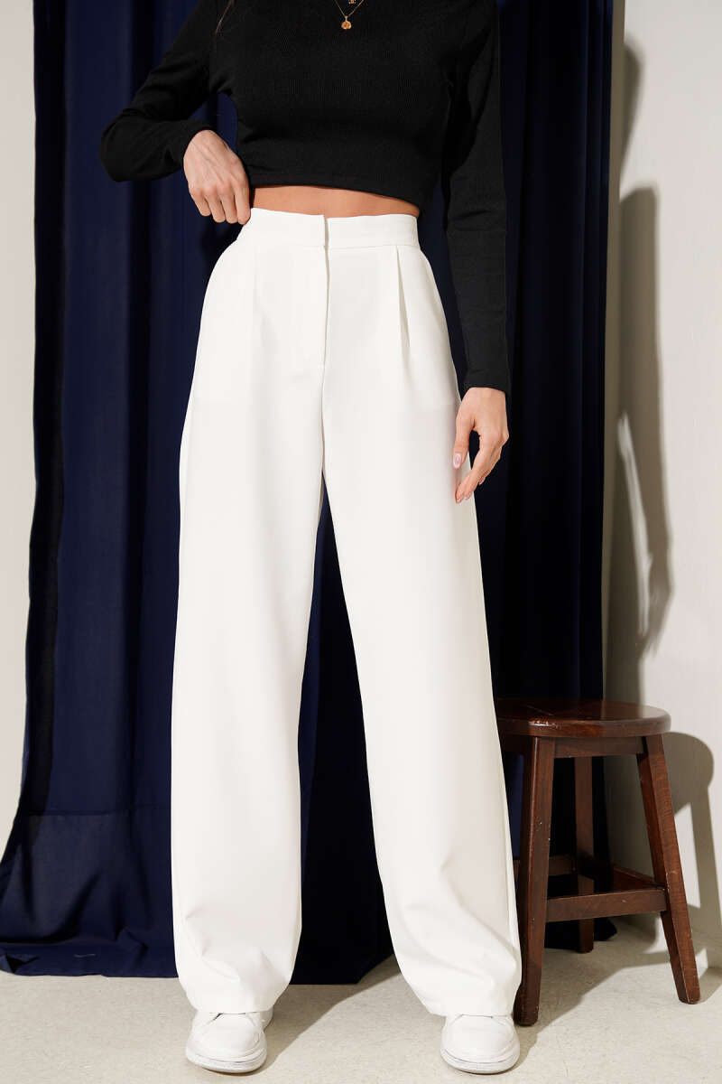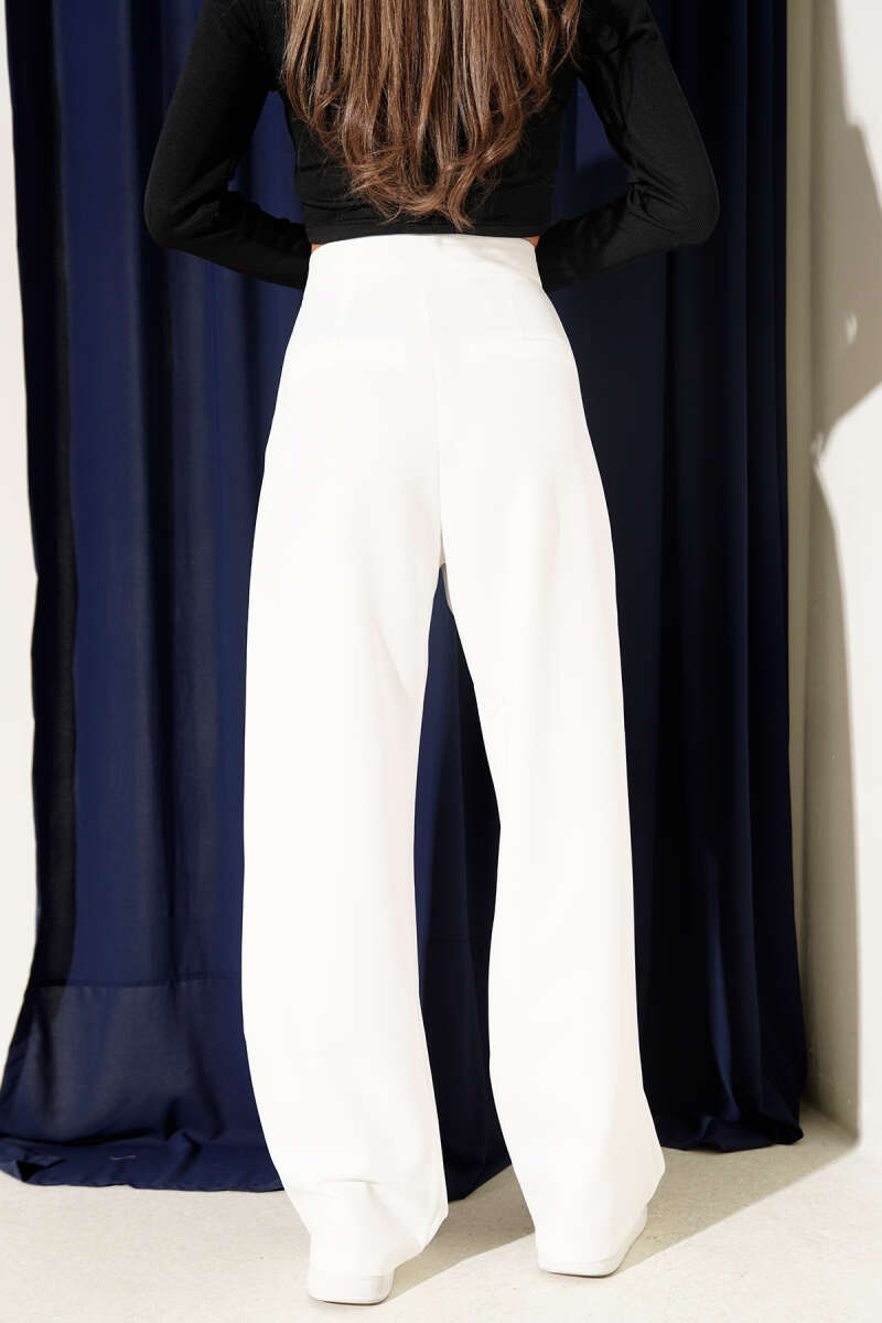 Bel Pensli Geniş Paça Pantolon Ekru