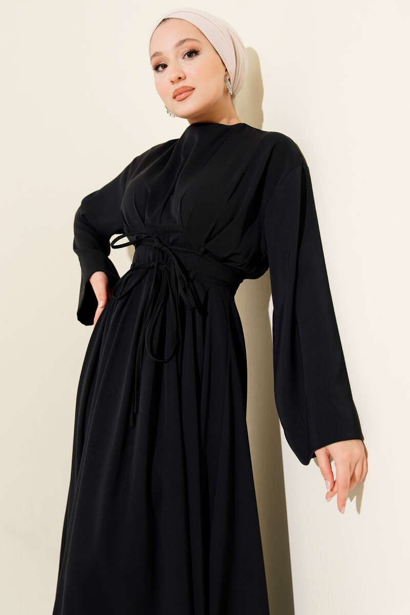Bel Pensli İp Kuşaklı Elbise Siyah