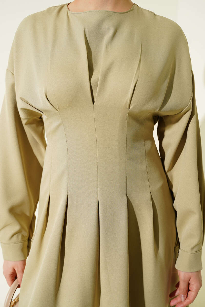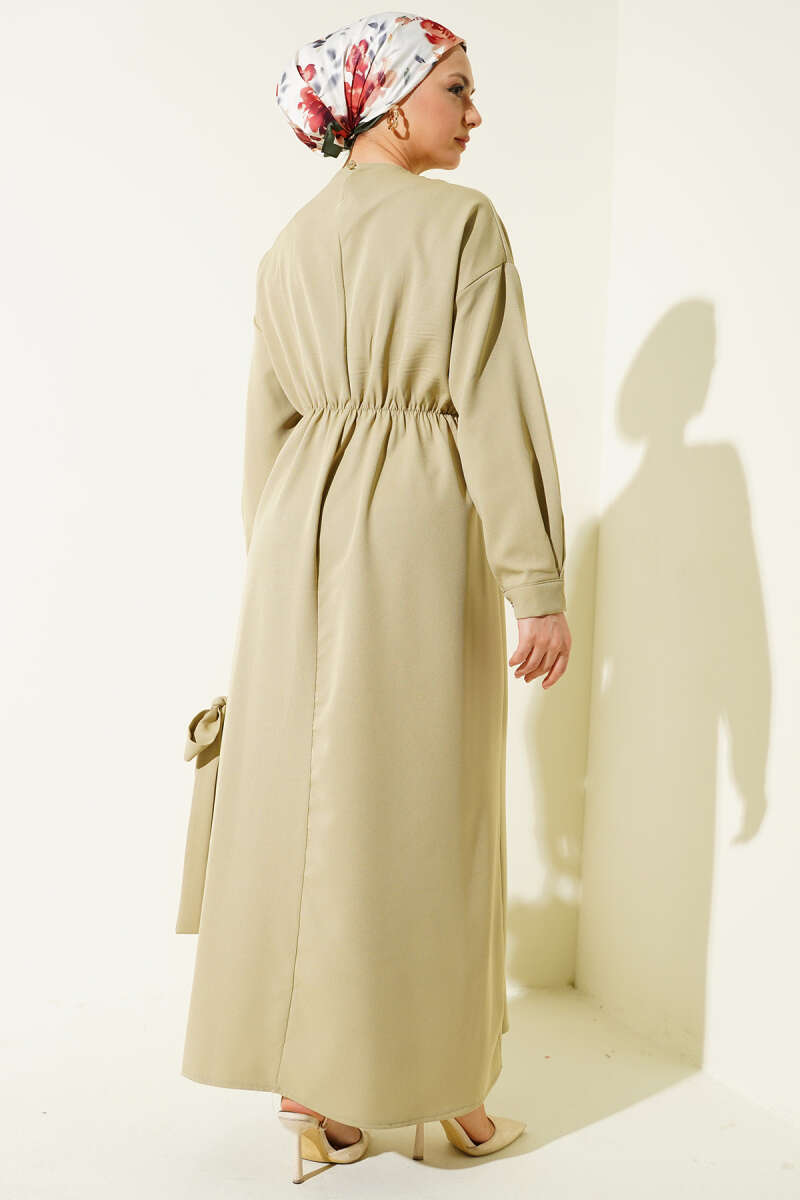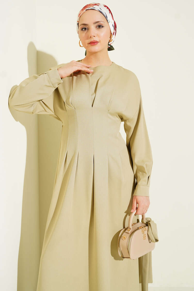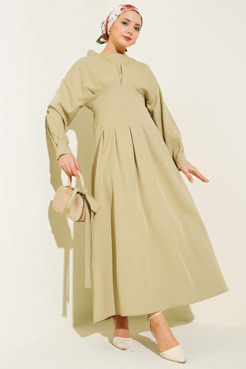 Bel Pensli Kuşaklı Dabıl Elbise Bej