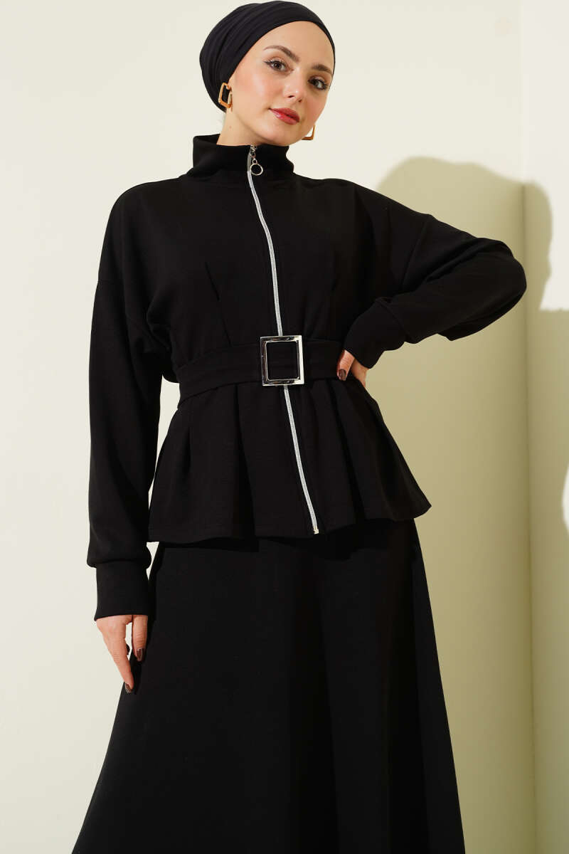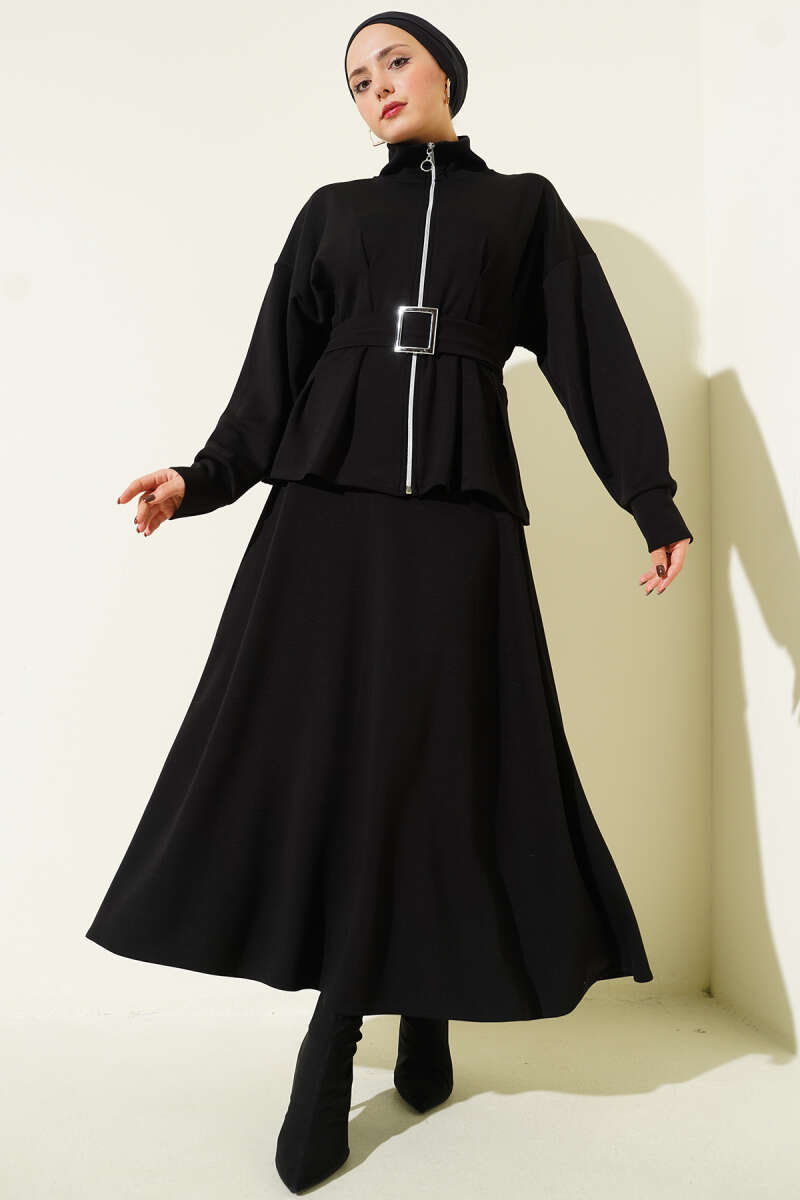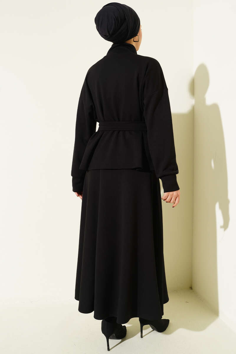 Cep Kapaklı Kemerli Ceket İkili Takım Siyah
