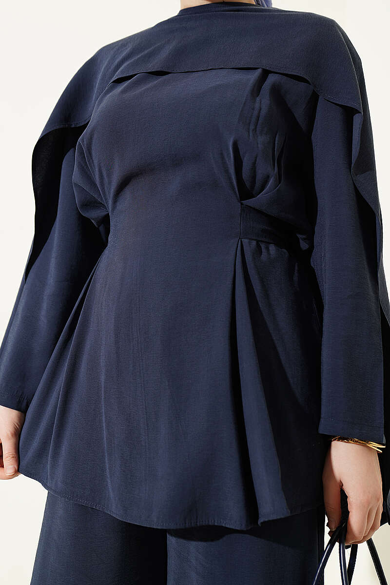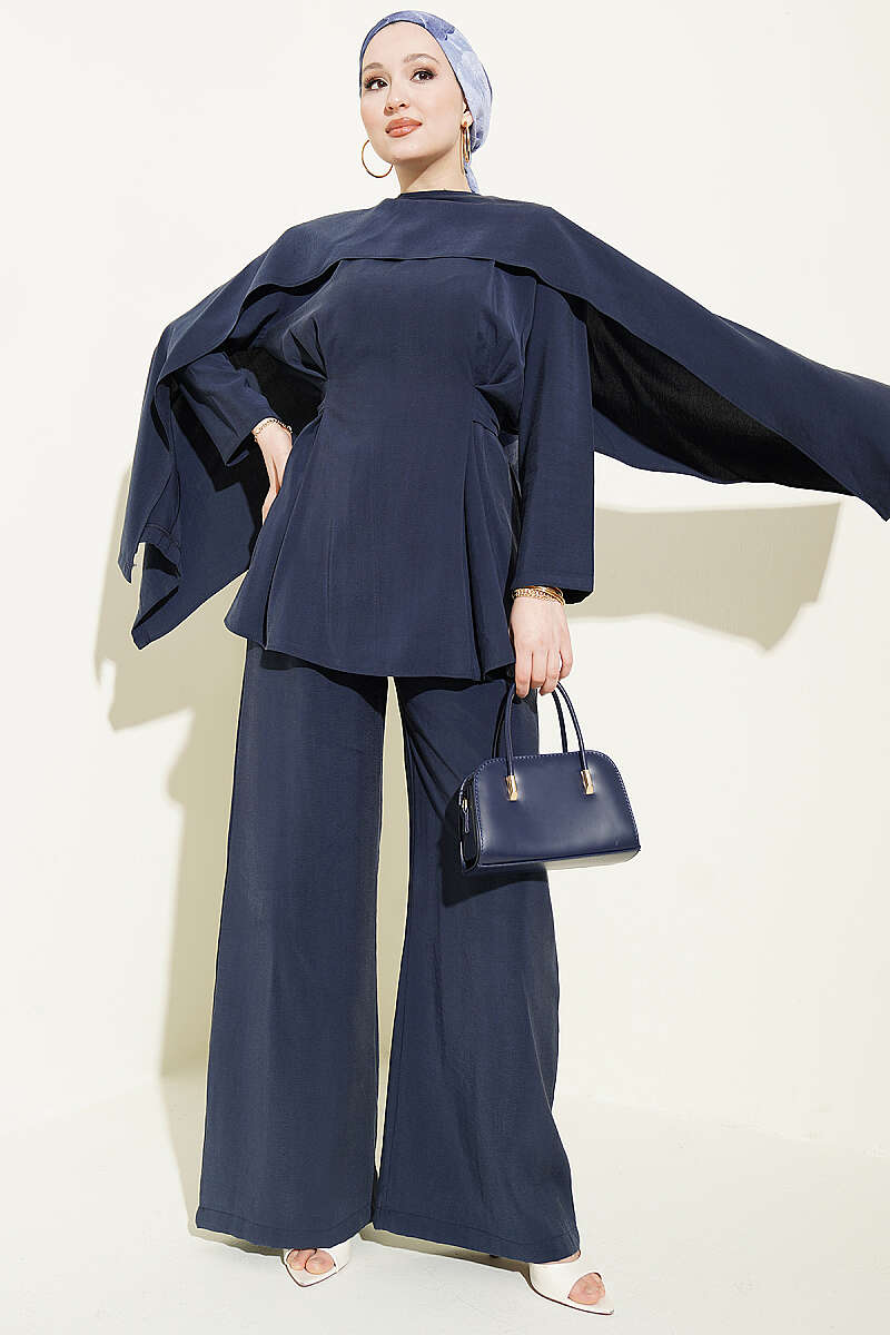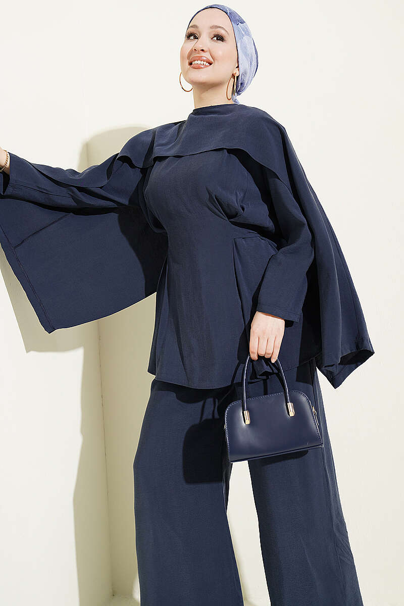 Bel Pensli Kuşaklı Omuz Pelerinli Takım Lacivert