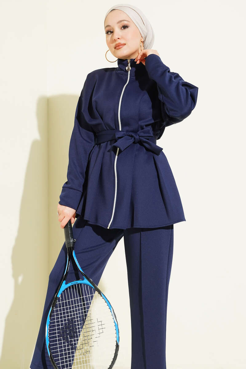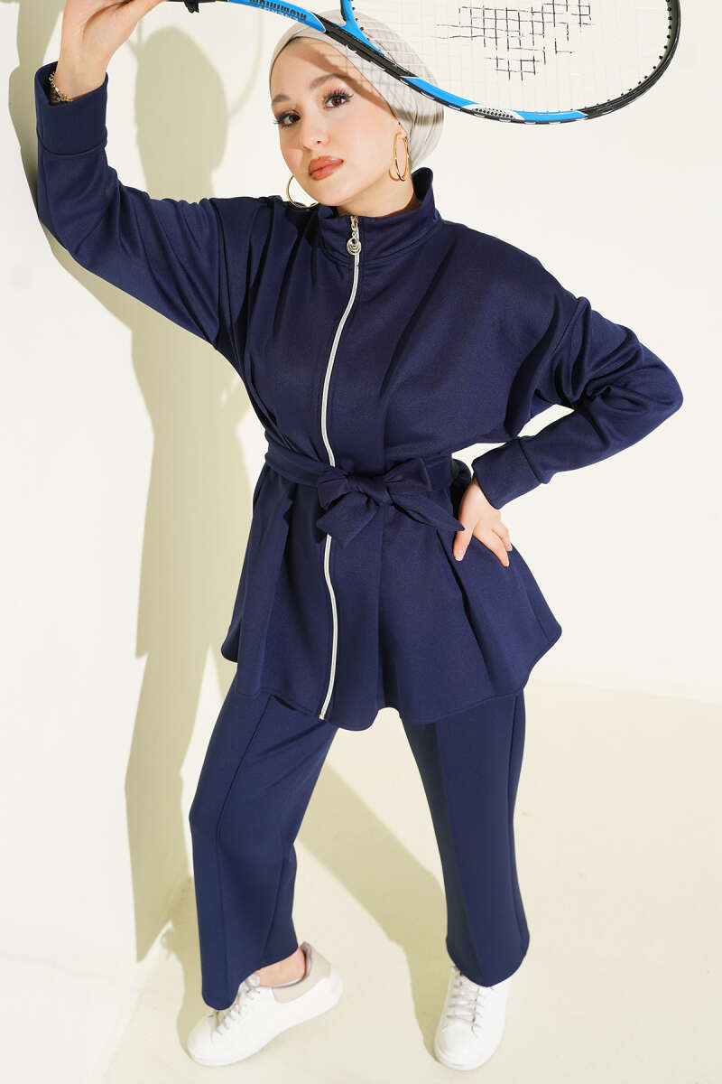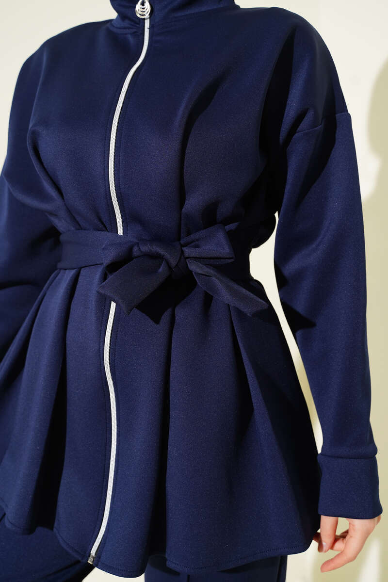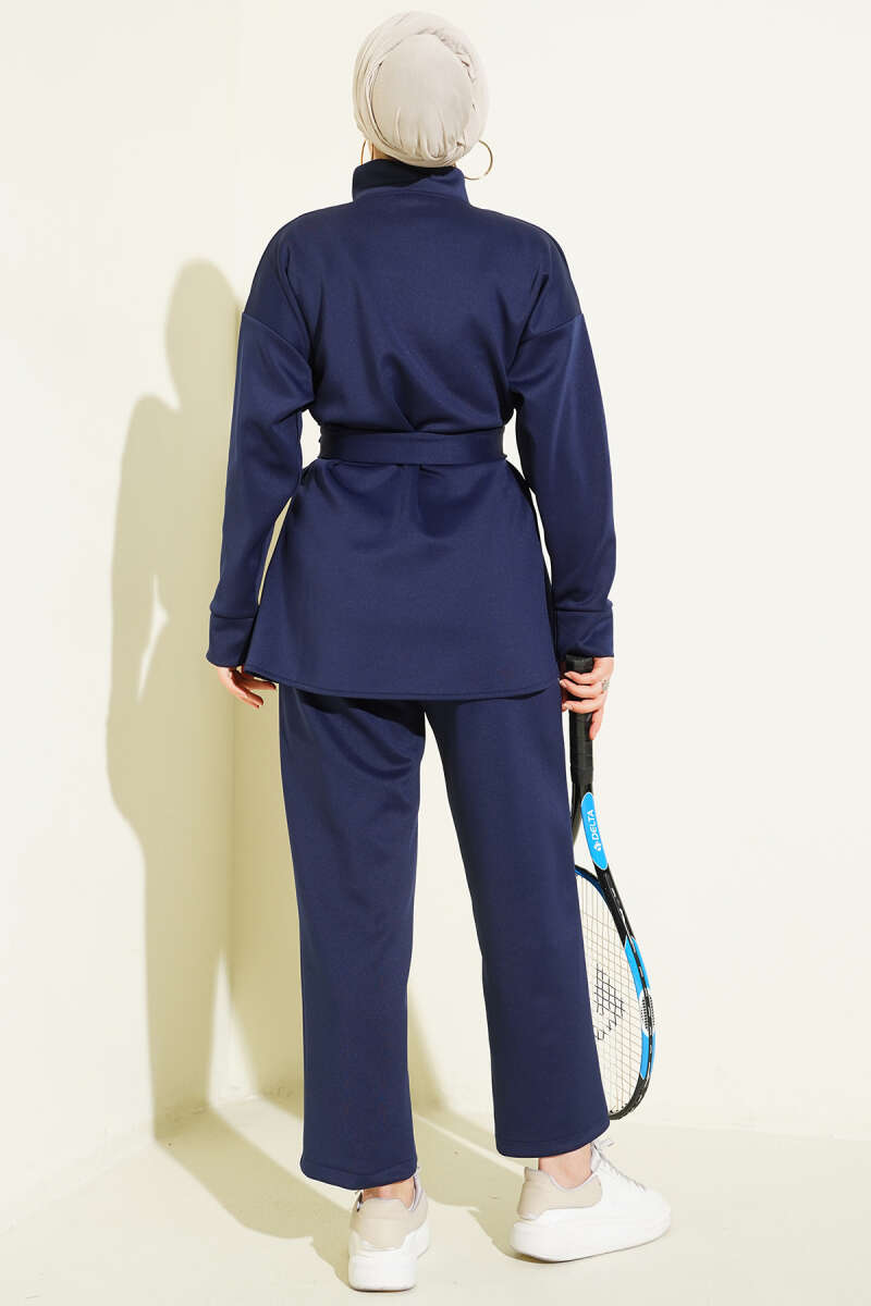 Brit Düğmeli İp Kuşaklı Tunik İkili Takım Mavi