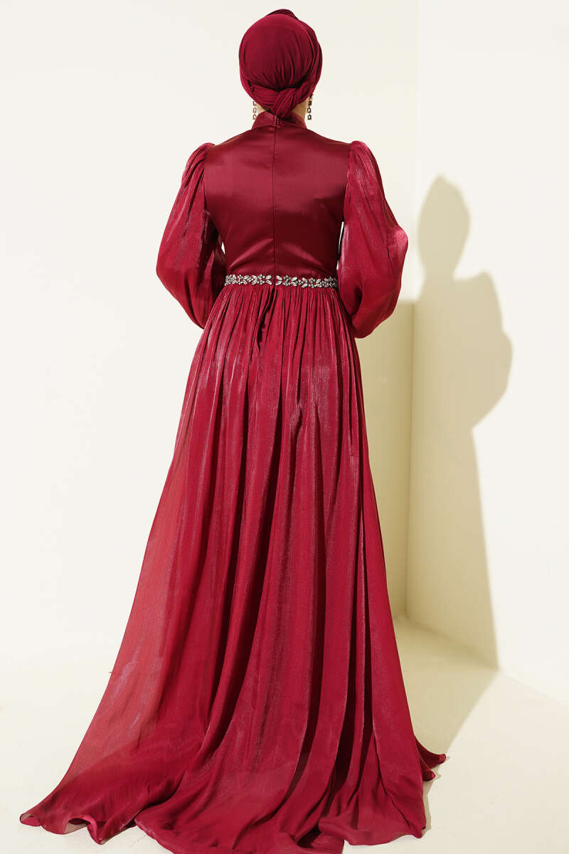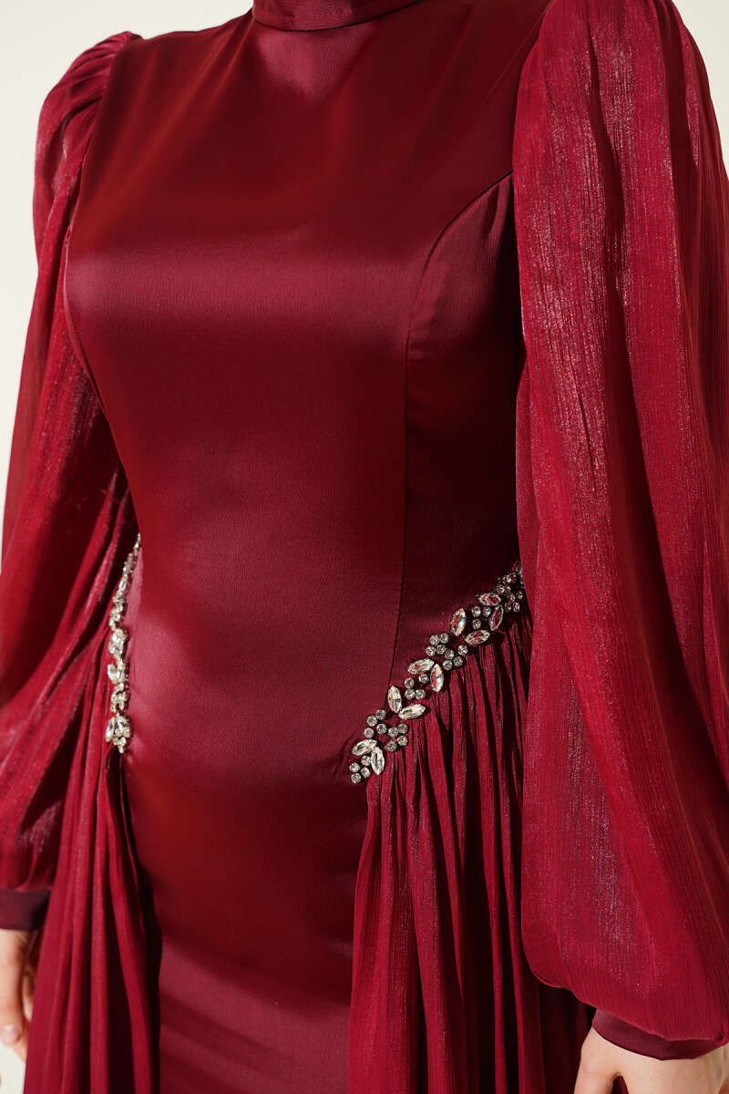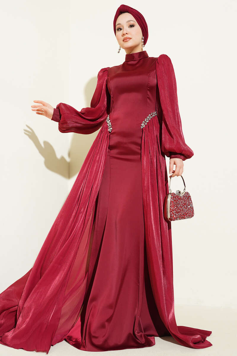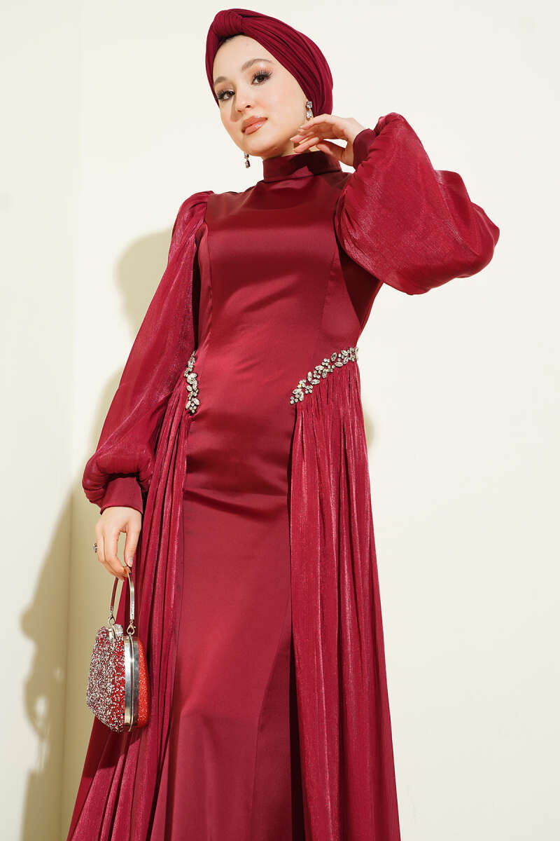 Bel Taşlı Pelerinli Abiye Elbise Kahve