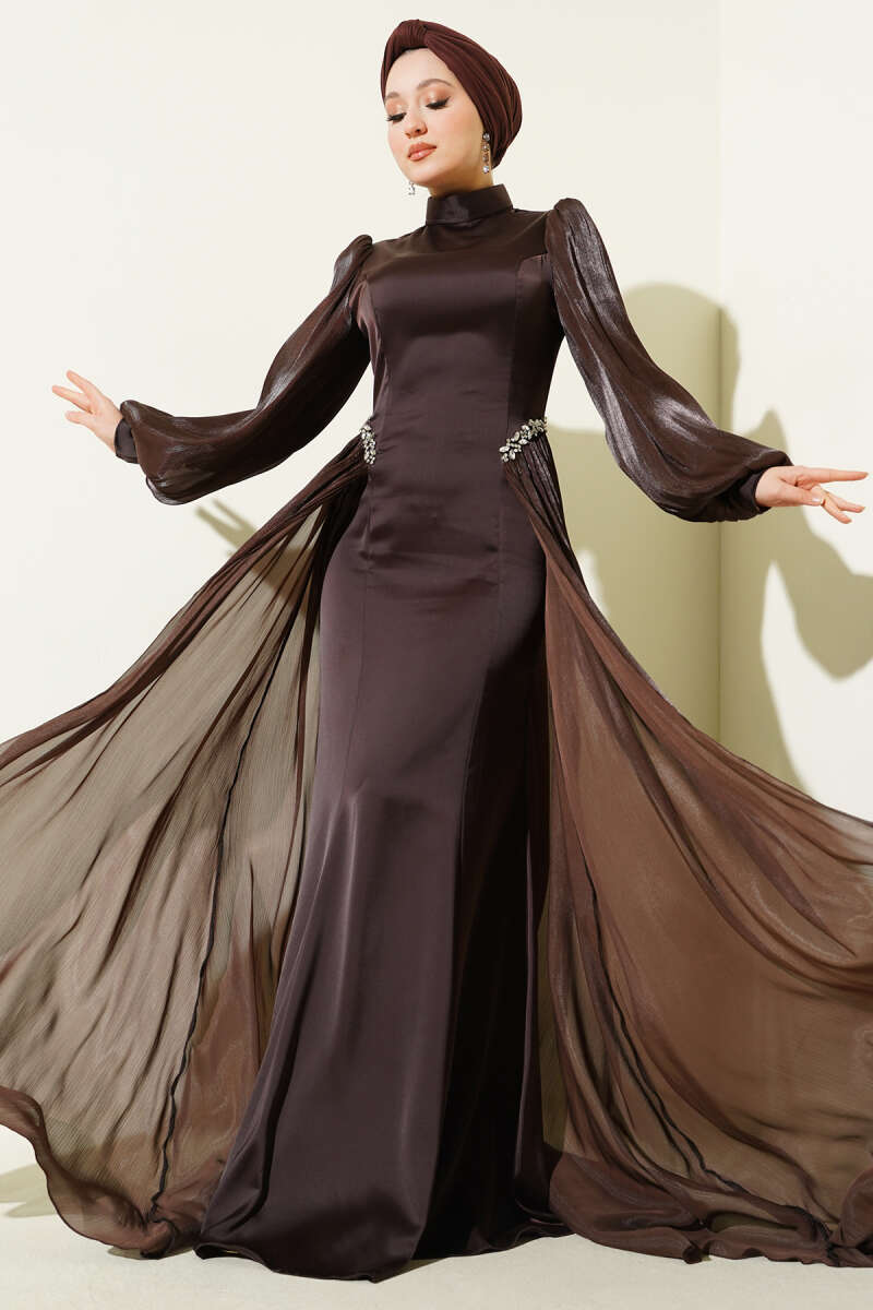 Bel Taşlı Pelerinli Abiye Elbise Haki