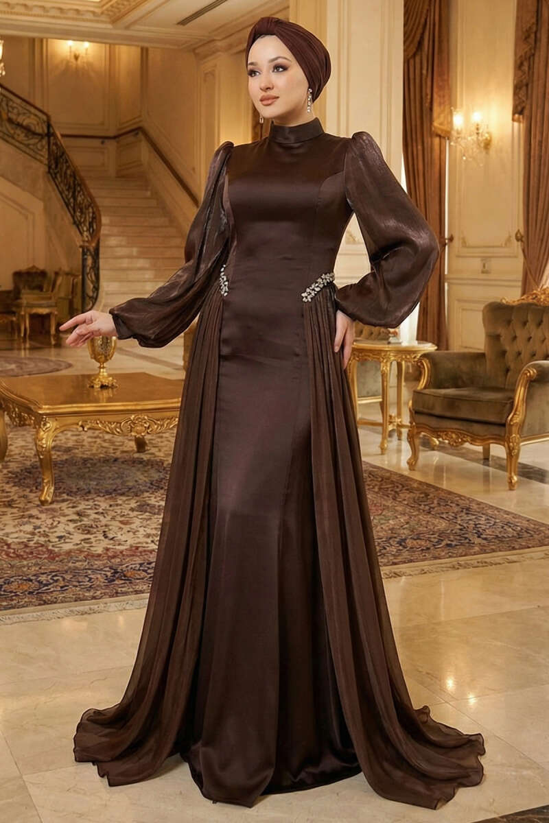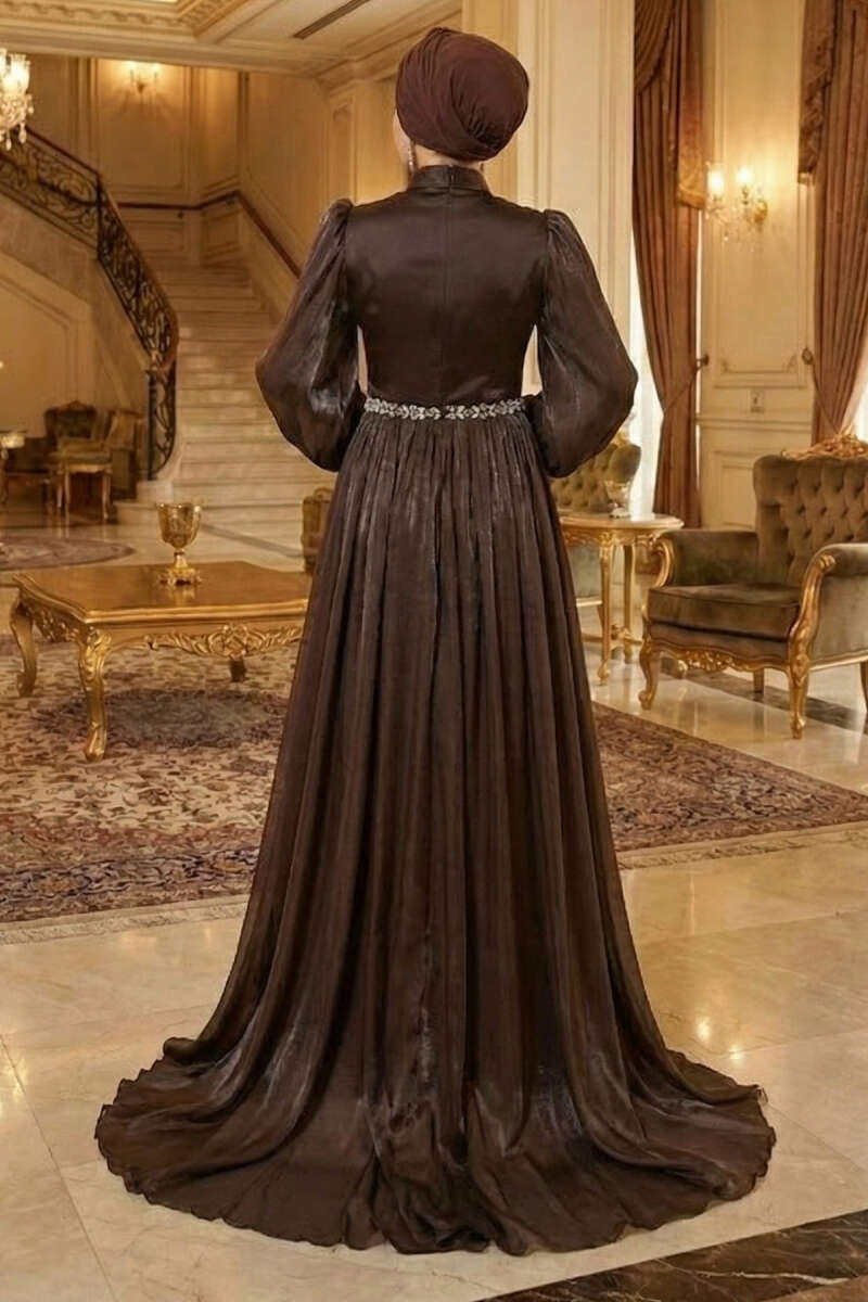 Bel Taşlı Pelerinli Abiye Elbise Kahve
