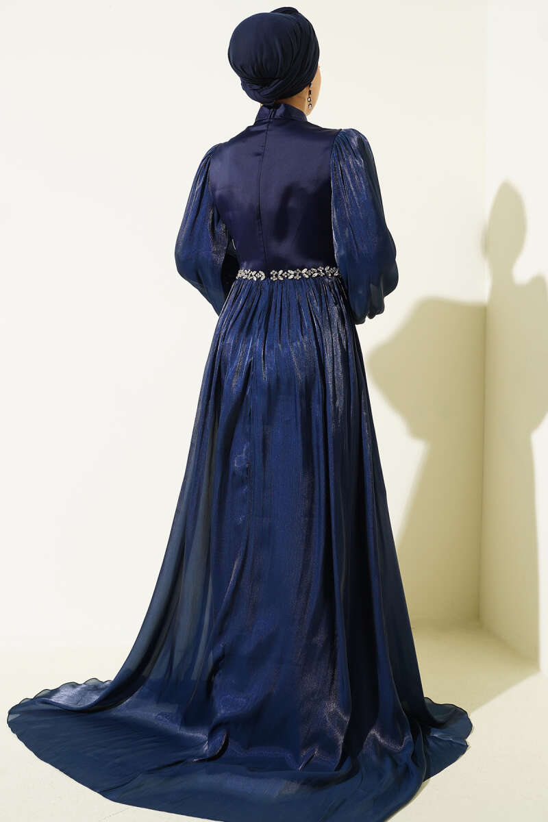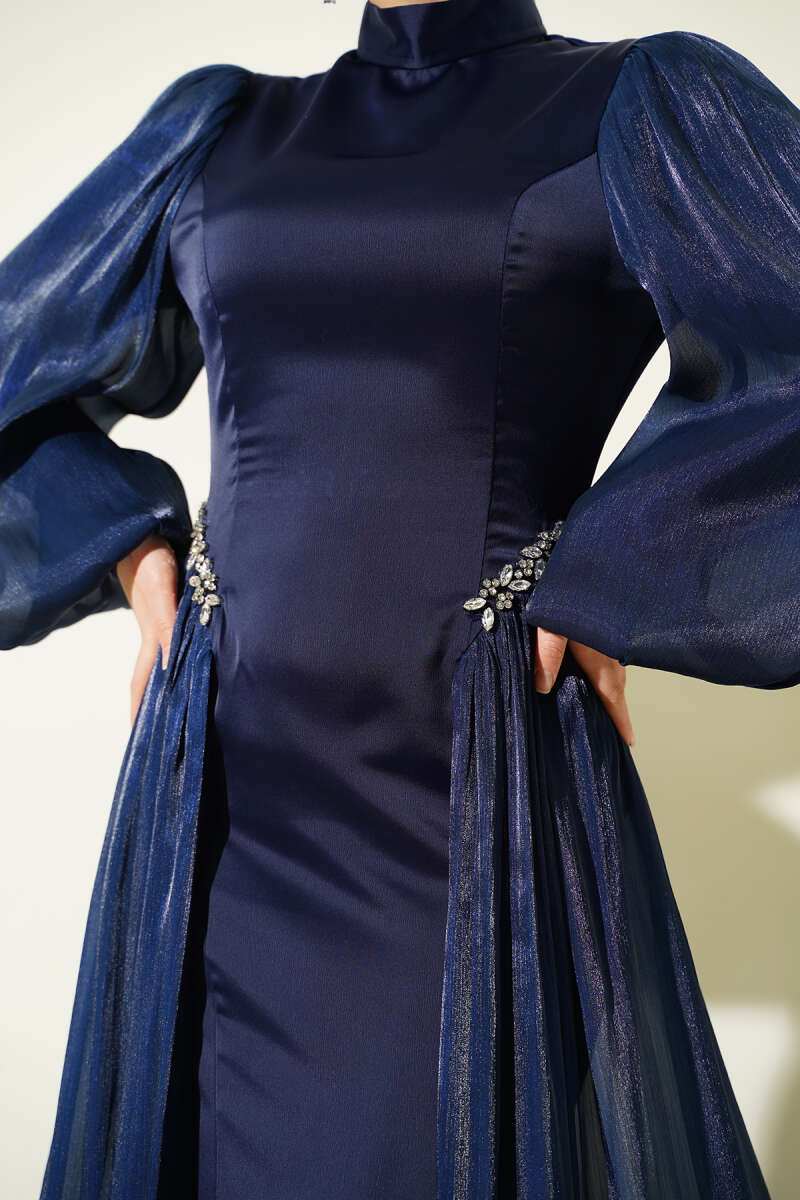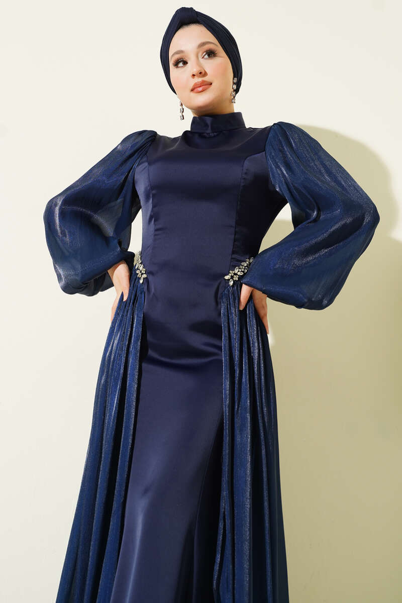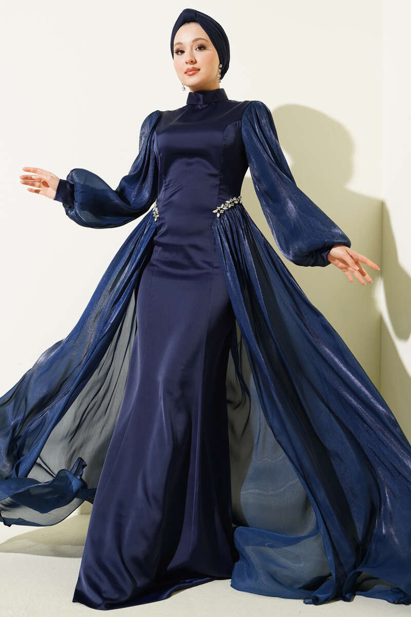 Omuz Pelerin Detaylı Abiye Elbise Lacivert