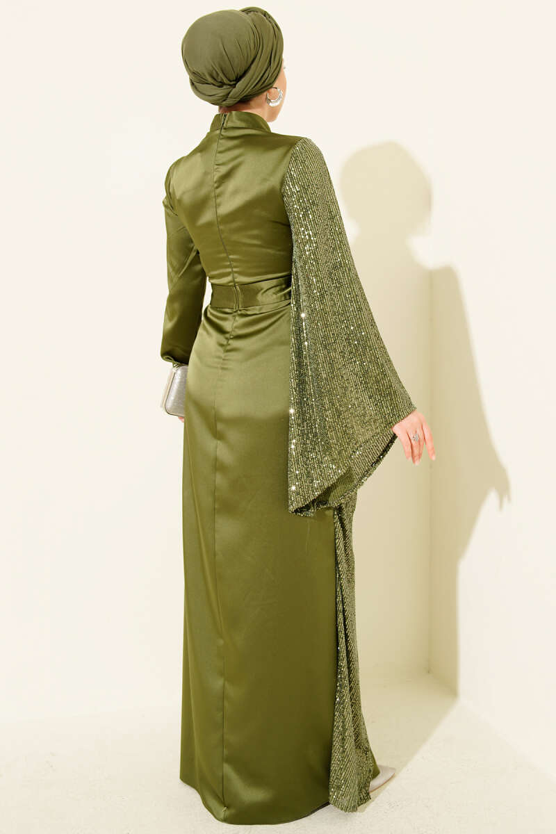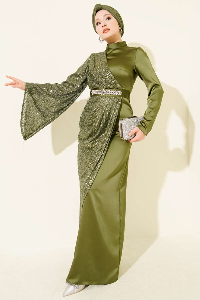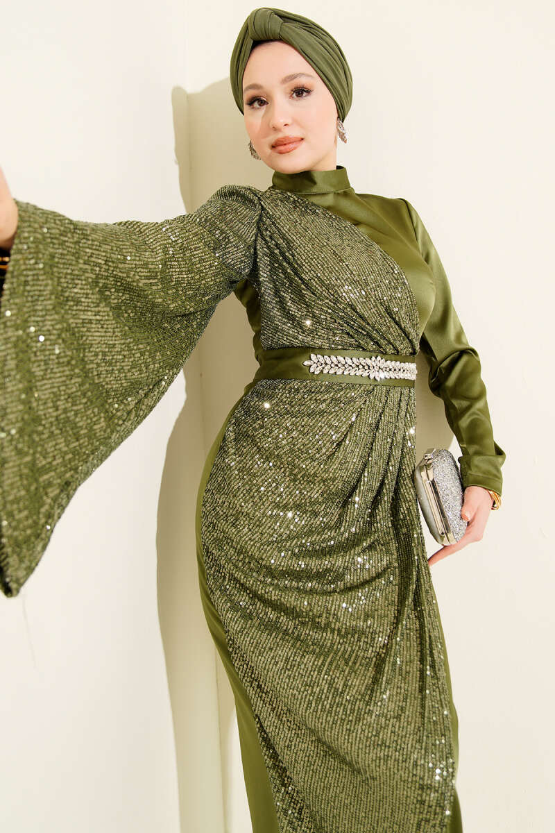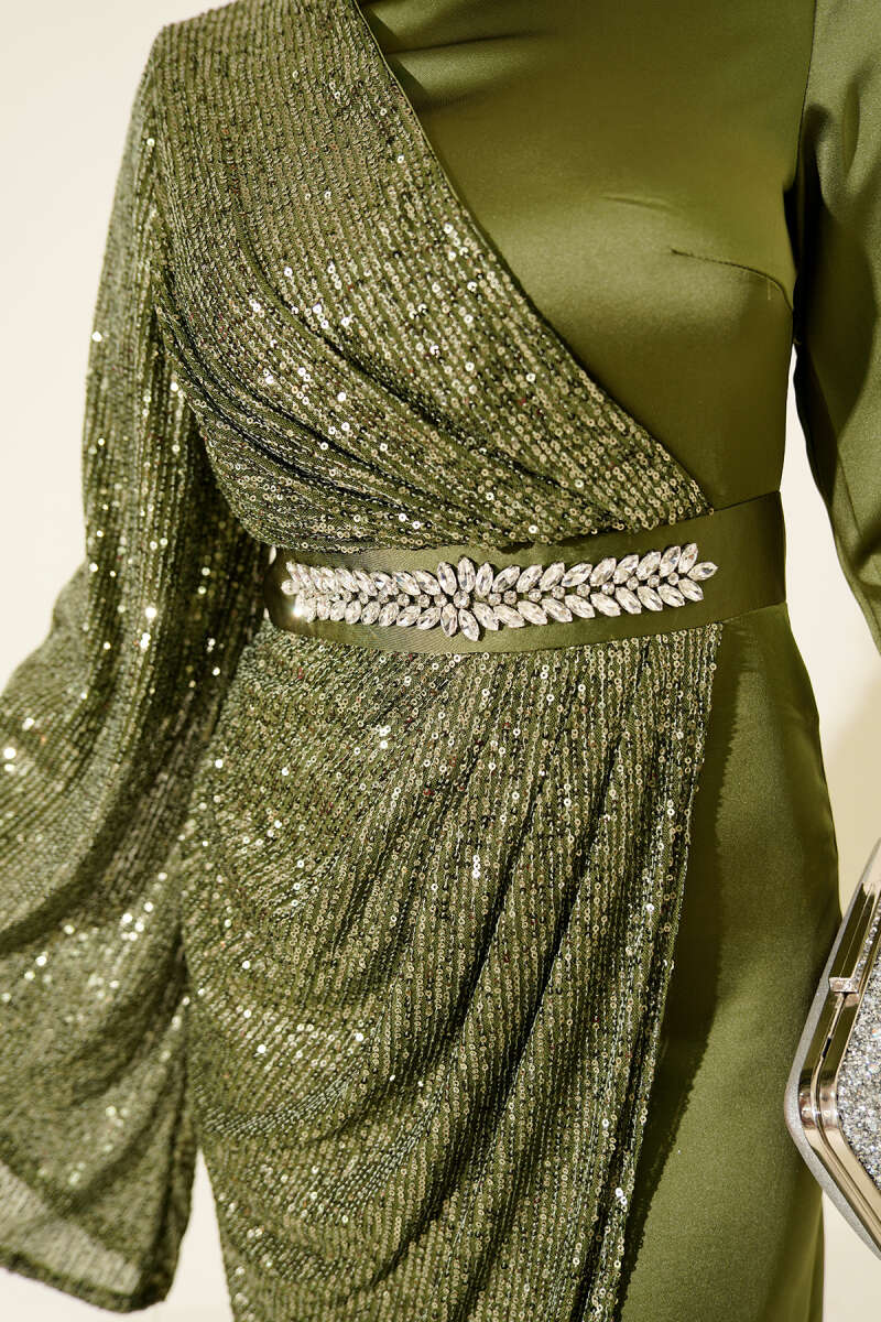 Kuşaklı Simli Pullu Abiye Elbise Haki
