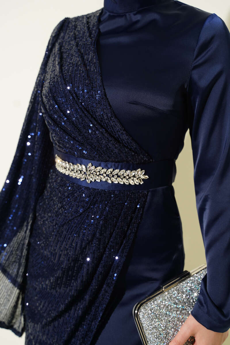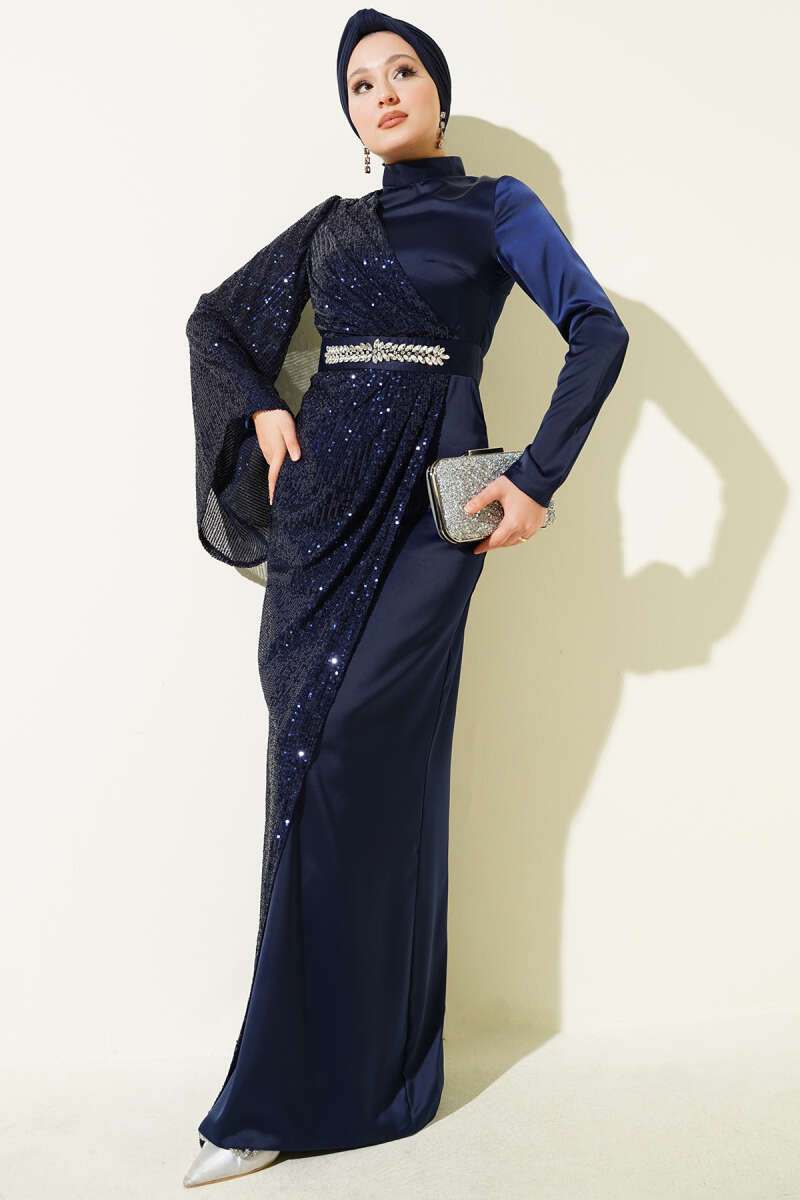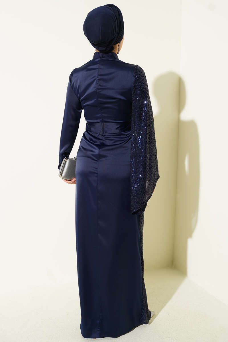 Bilek Tüylü Kuşaklı Abiye Elbise Lacivert