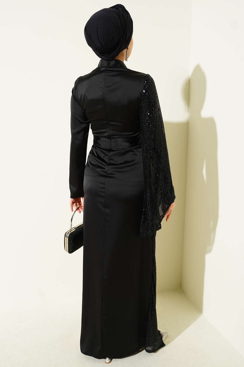 Bilek Tüylü Kuşaklı Abiye Elbise Siyah