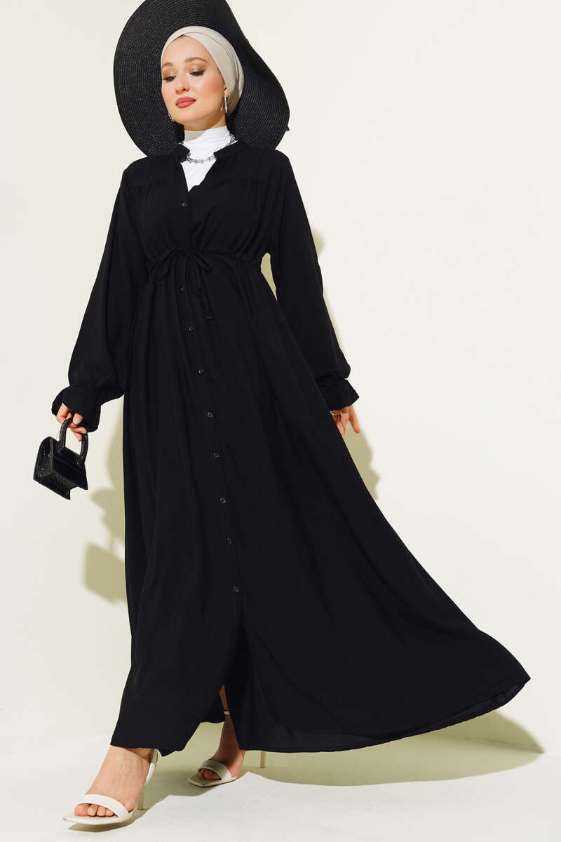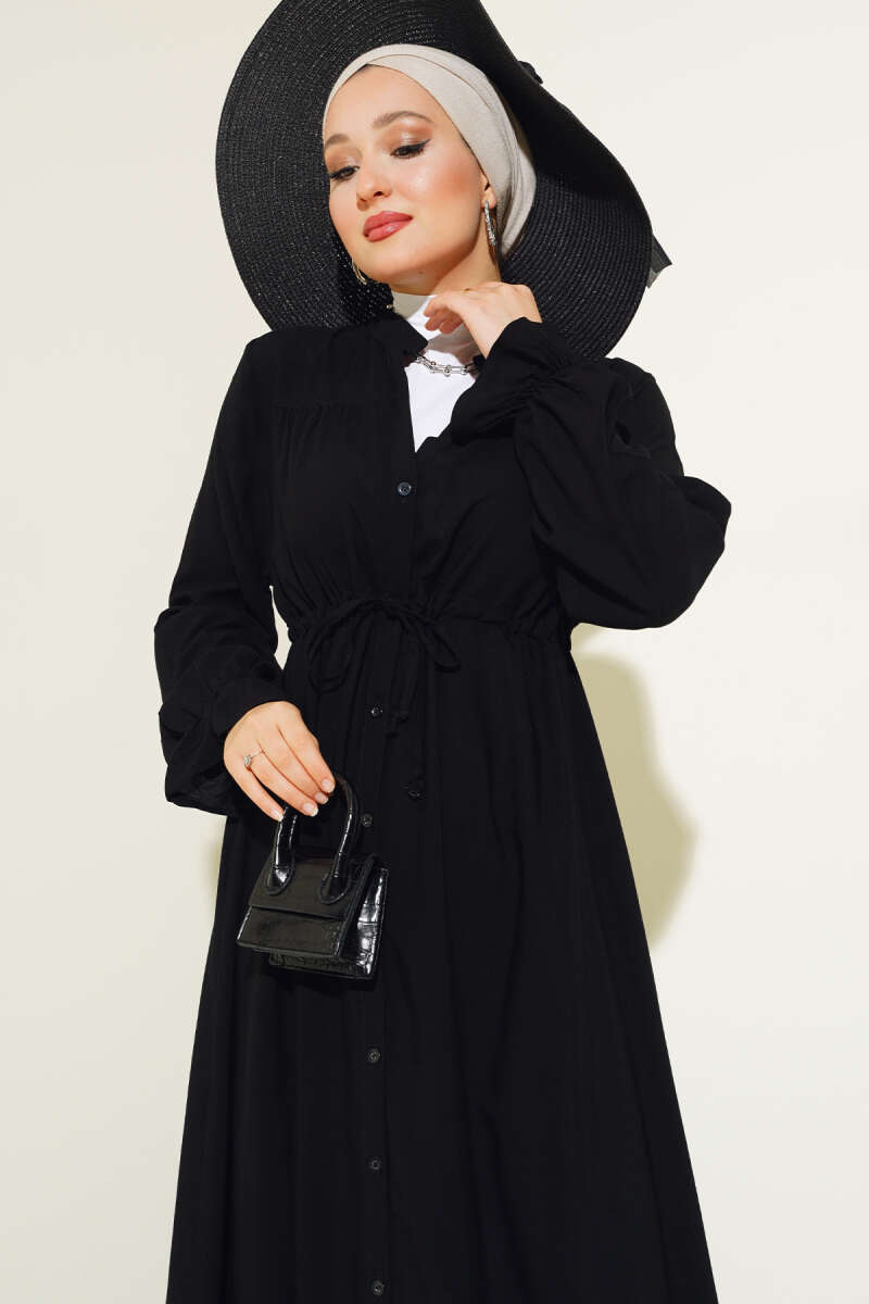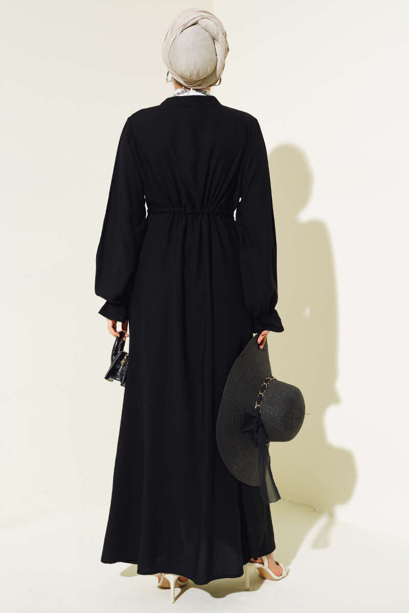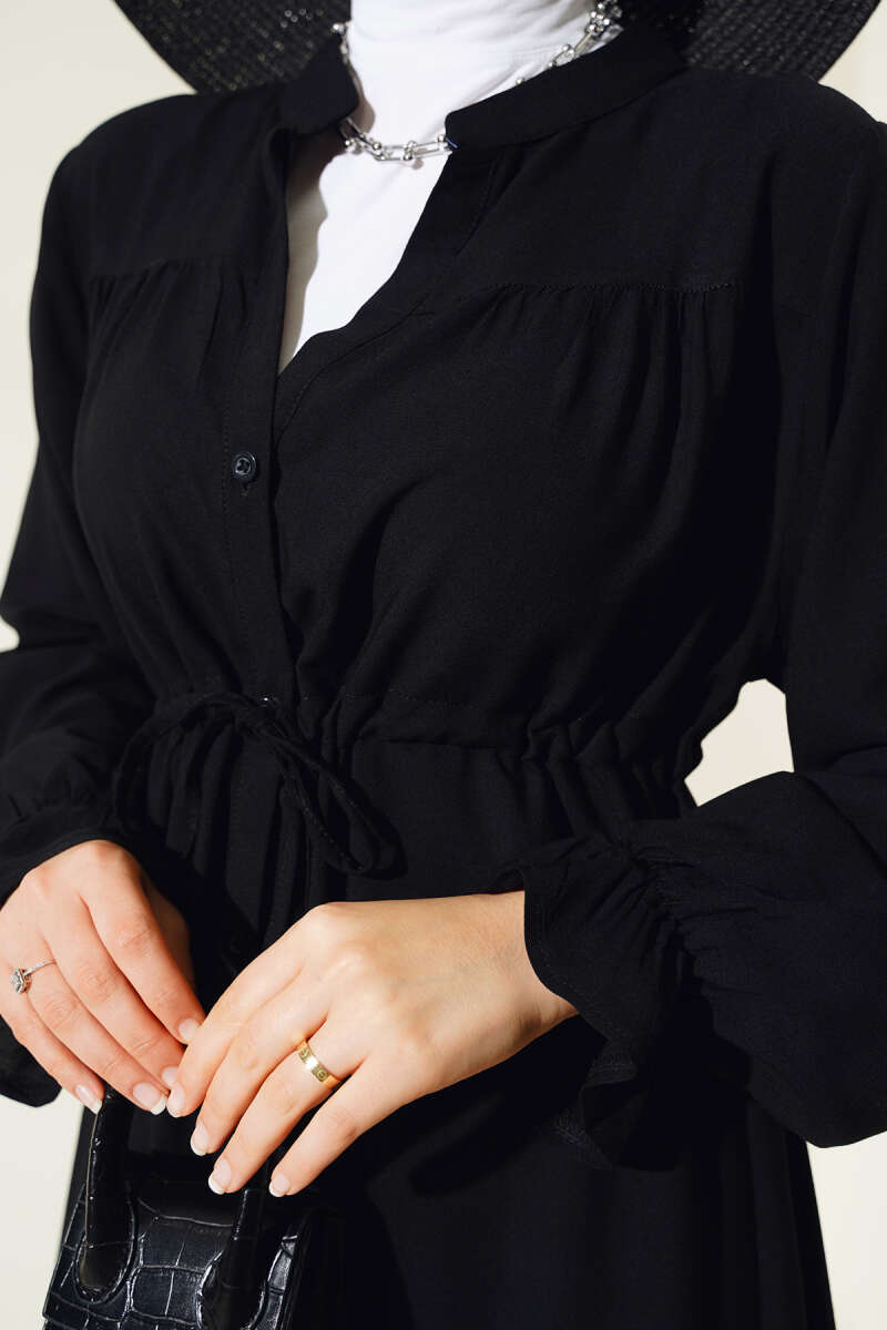 Bel Tünelli Boydan Düğmeli Elbise Siyah