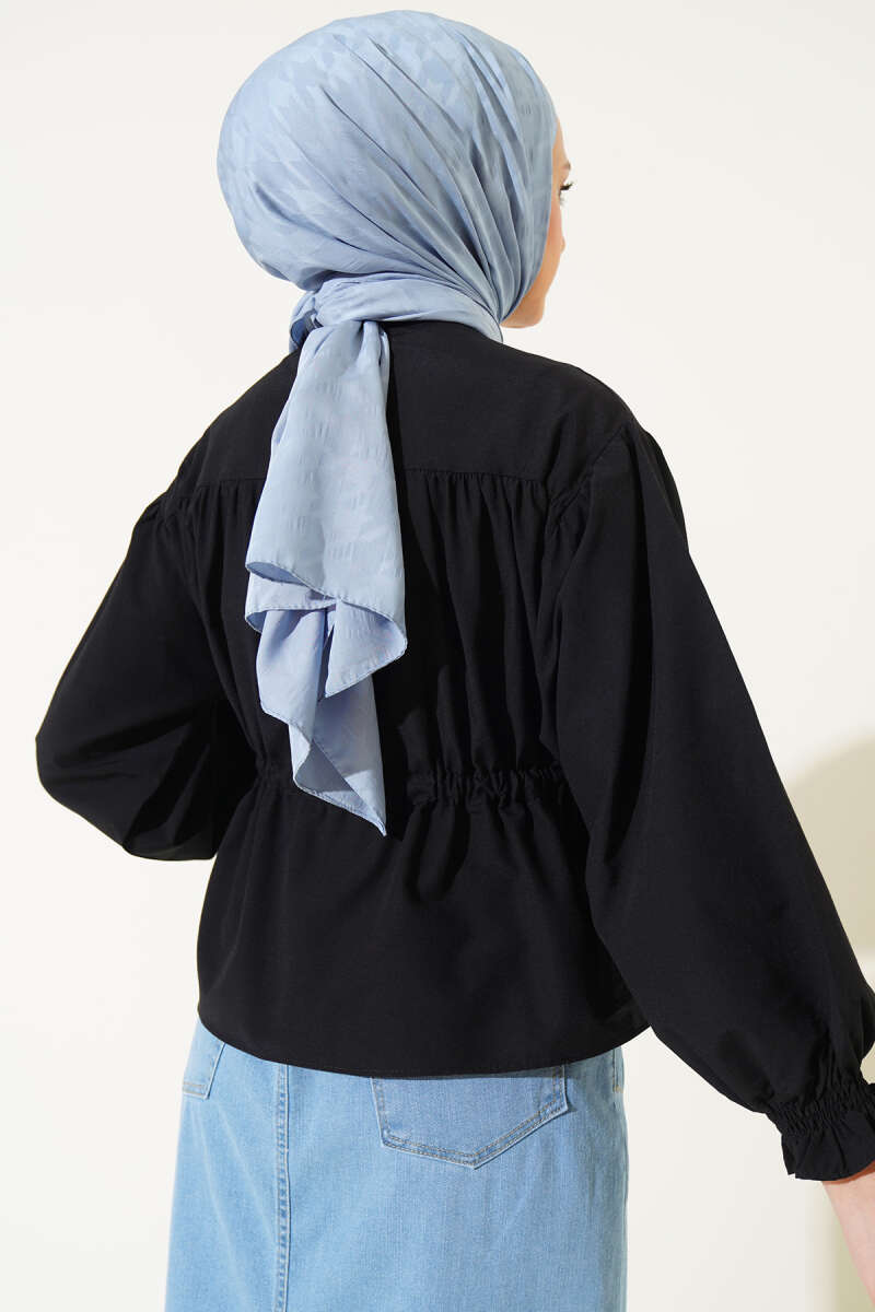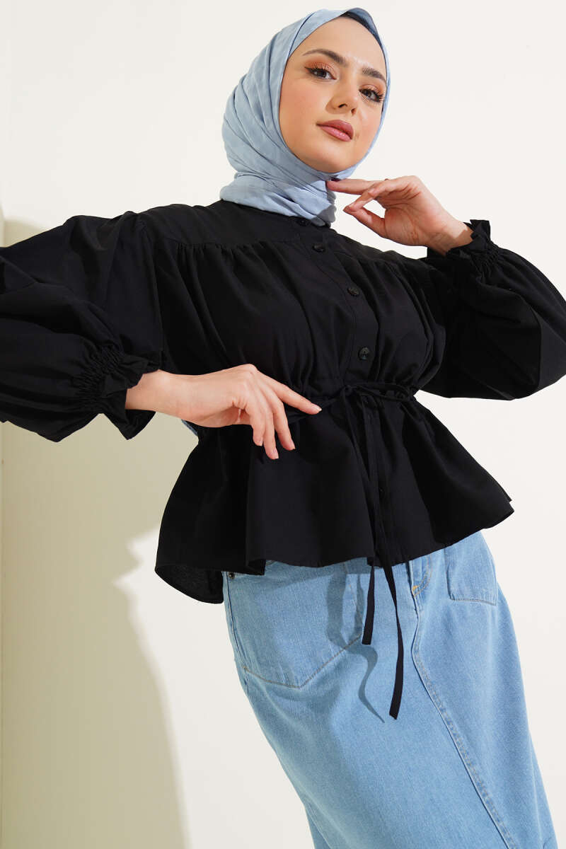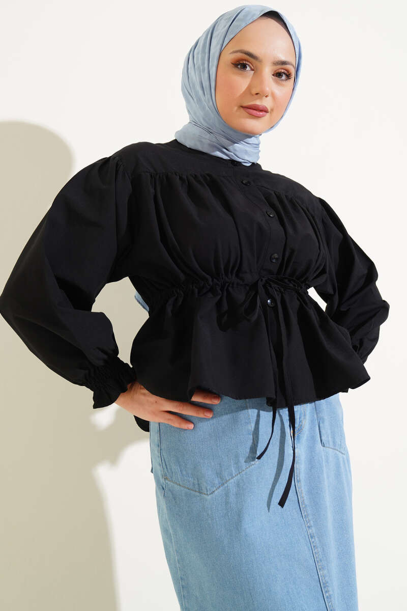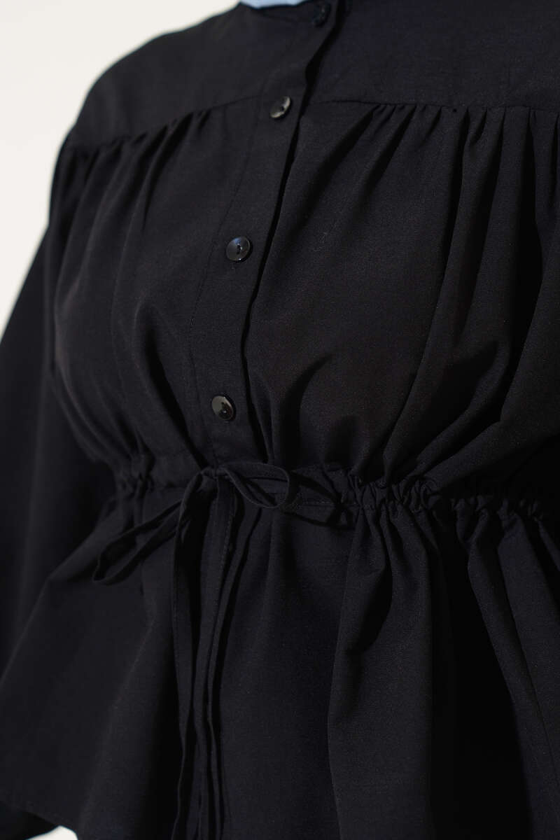 Gizli Düğmeli Bel Kuşaklı Gömlek Siyah