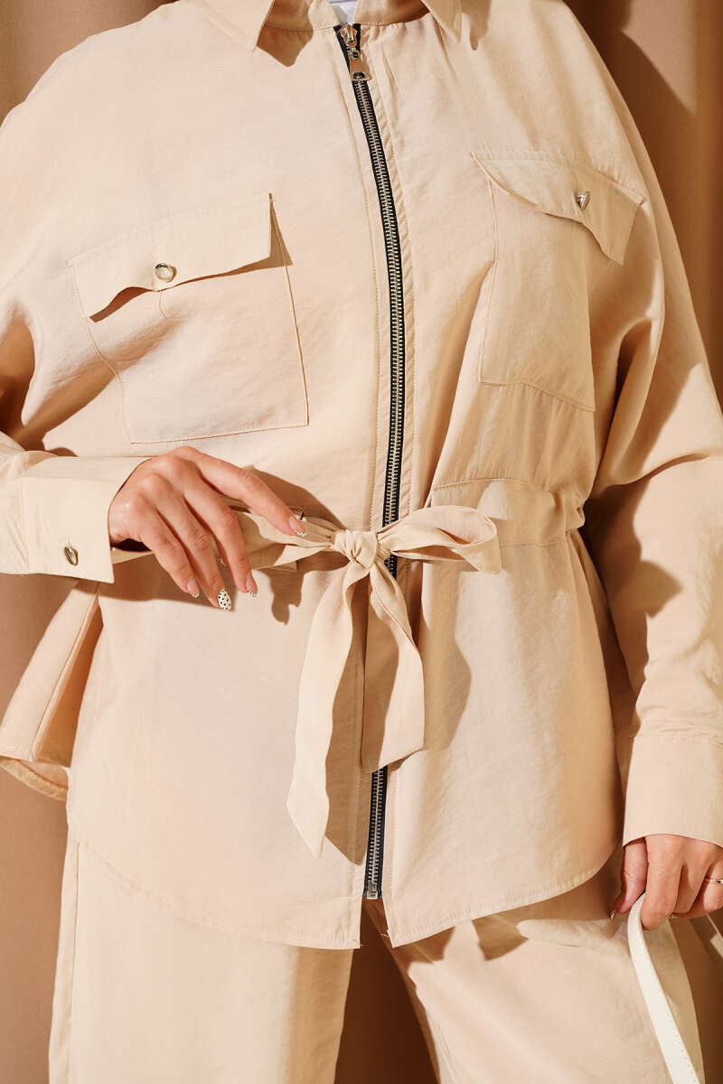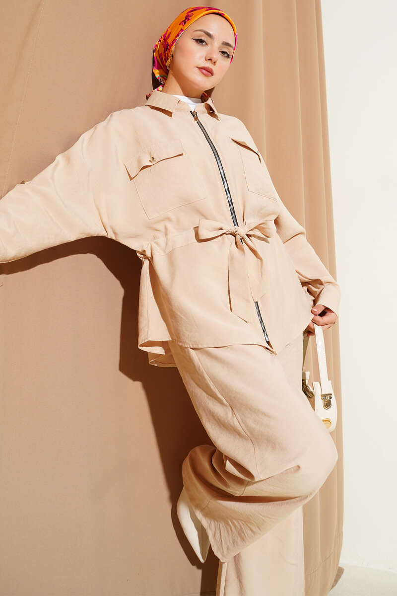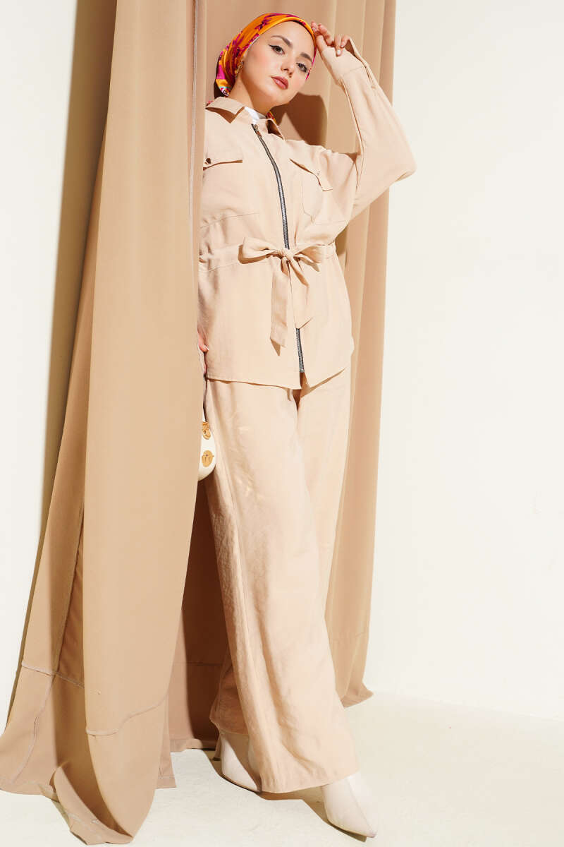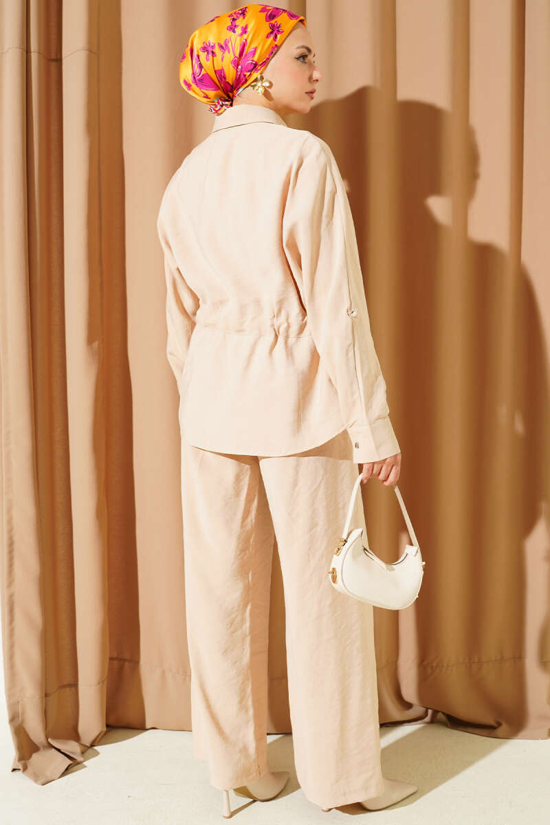 Metal Düğmeli Bel Tünelli Scuba İkili Takım Bej