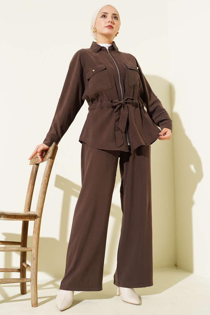 Gül Aksesuarlı Pileli Tunik İkili Takım Yeşil
