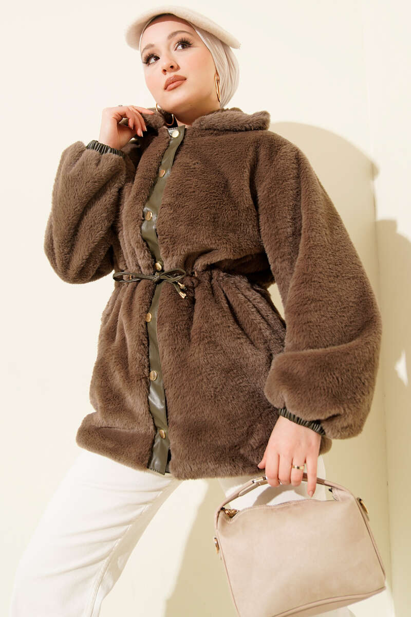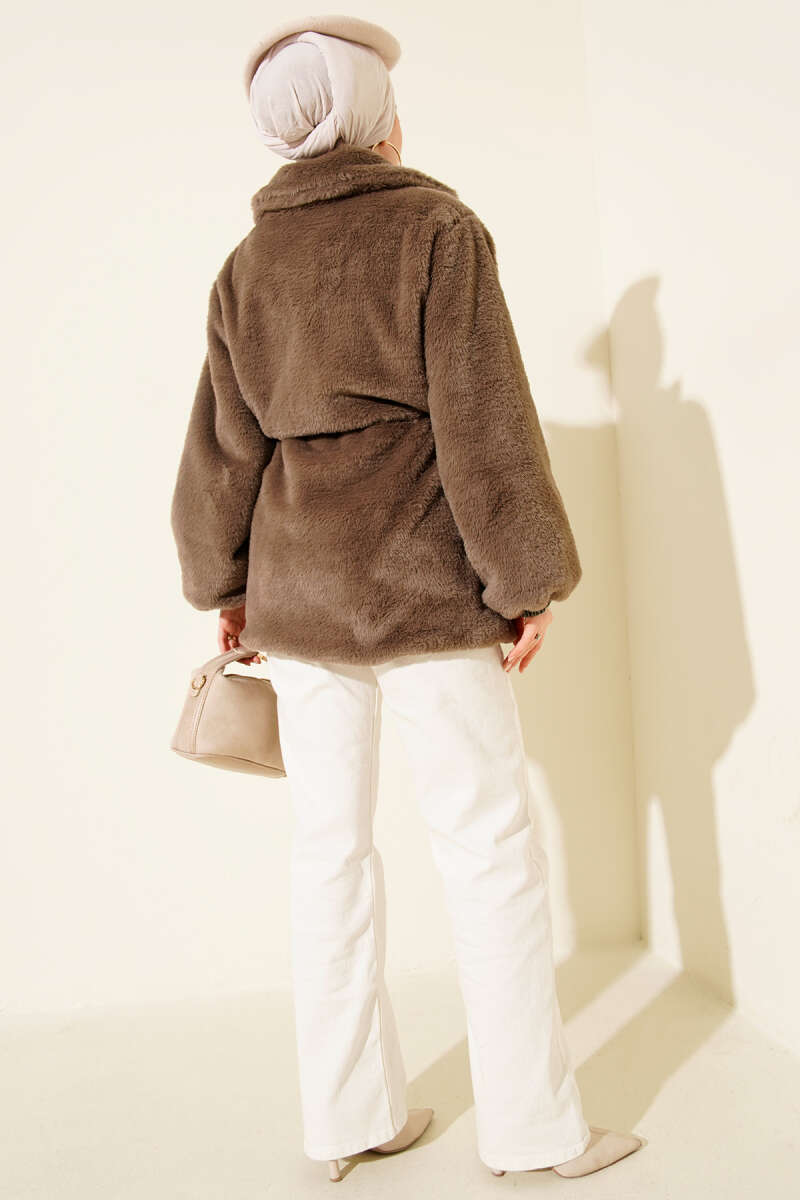 Bel Tünelli Çıtçıtlı Peluş Ceket Kahve