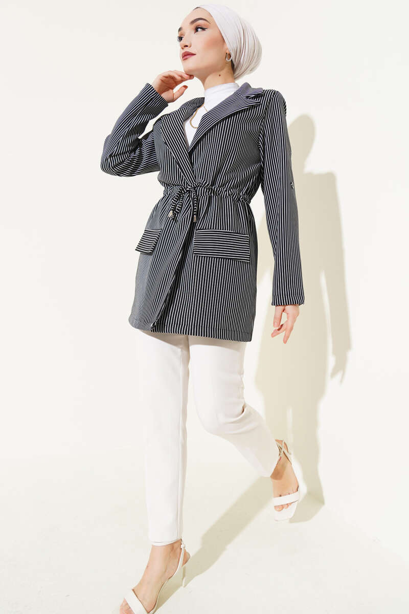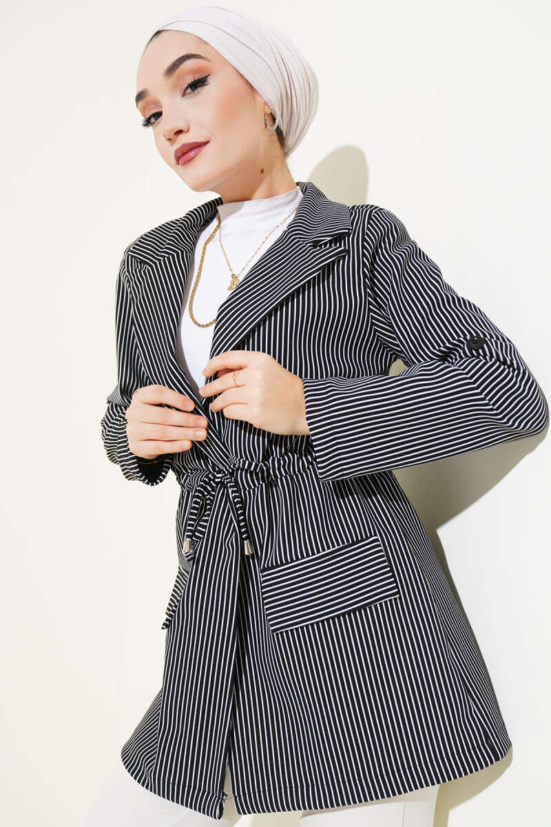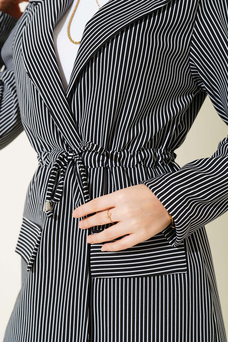Bel Tünelli Çizgili Ceket Siyah
