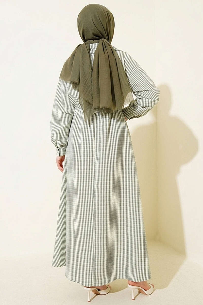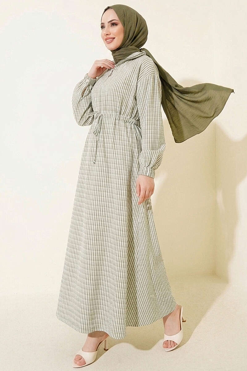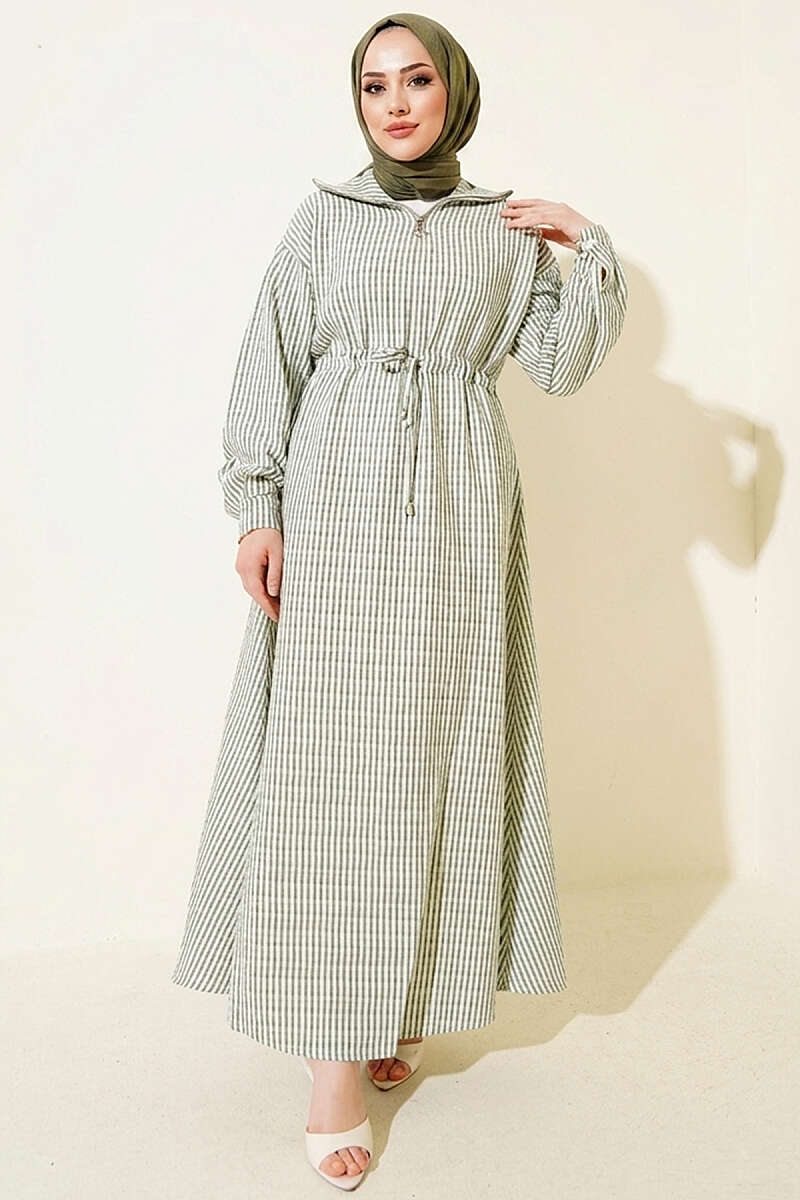 Bel Tünelli Çizgili Gofre Elbise Haki