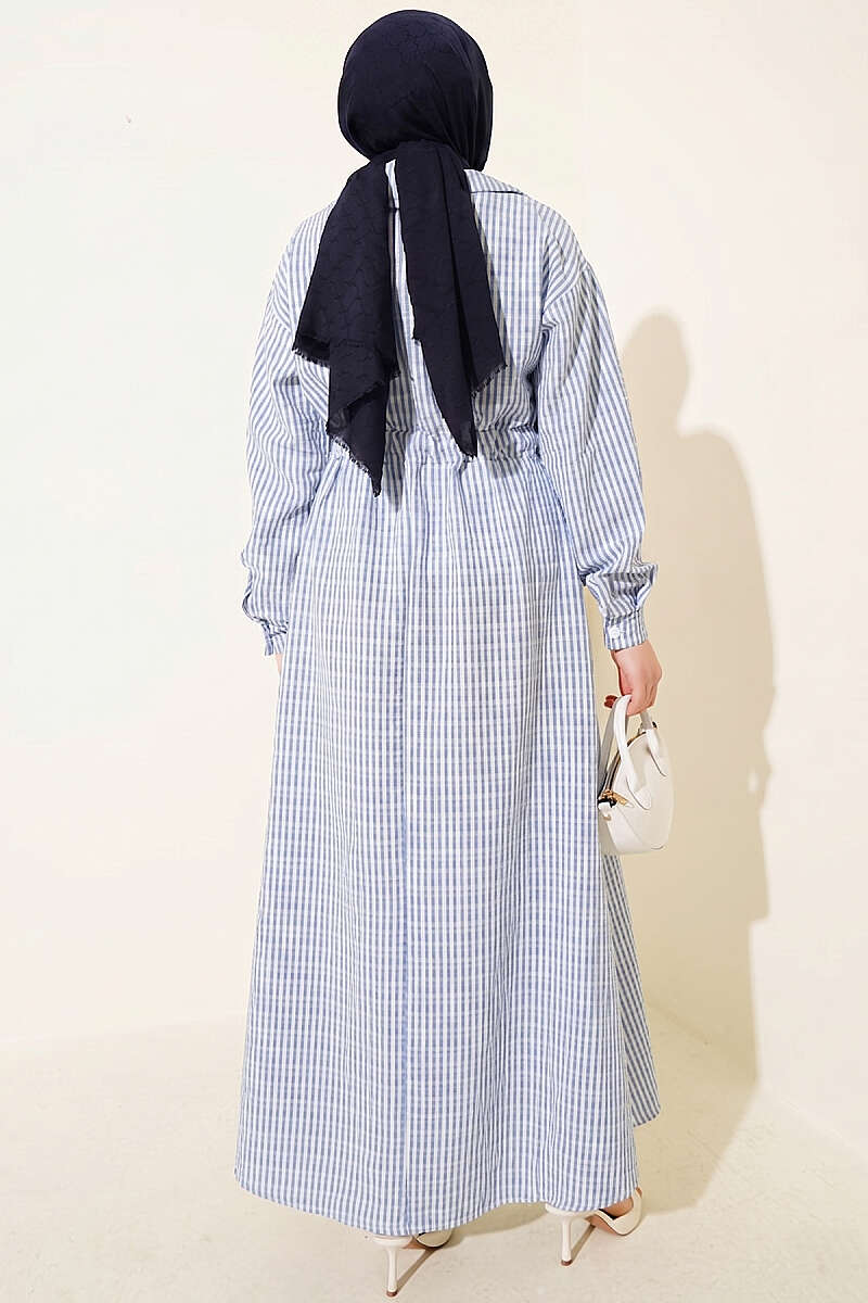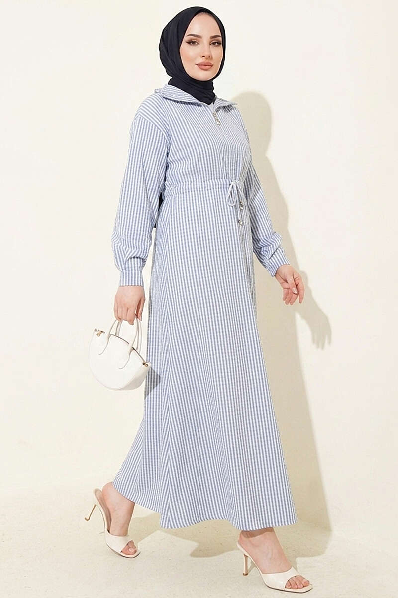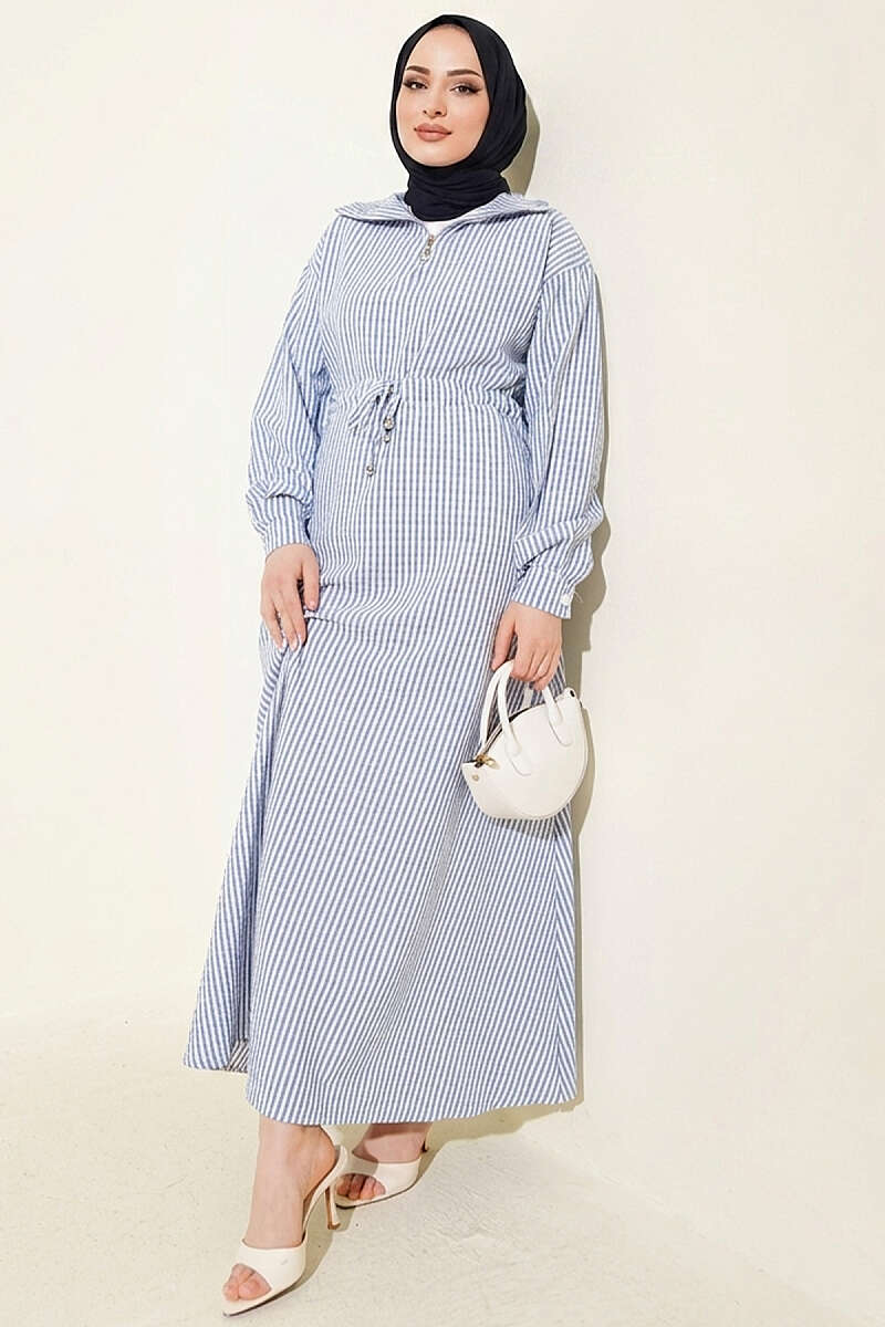 Bel Tünelli Çizgili Gofre Elbise Açık Mavi