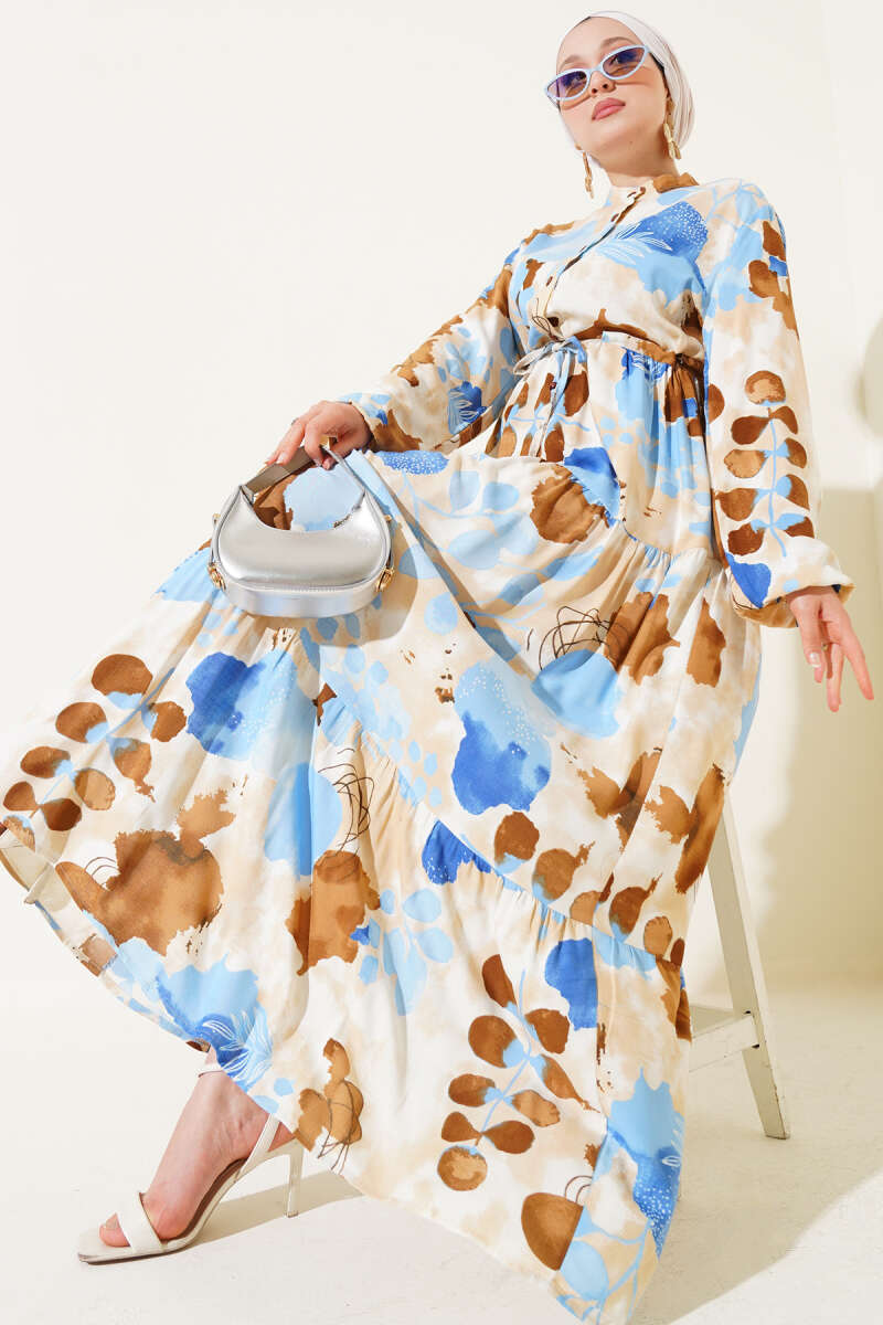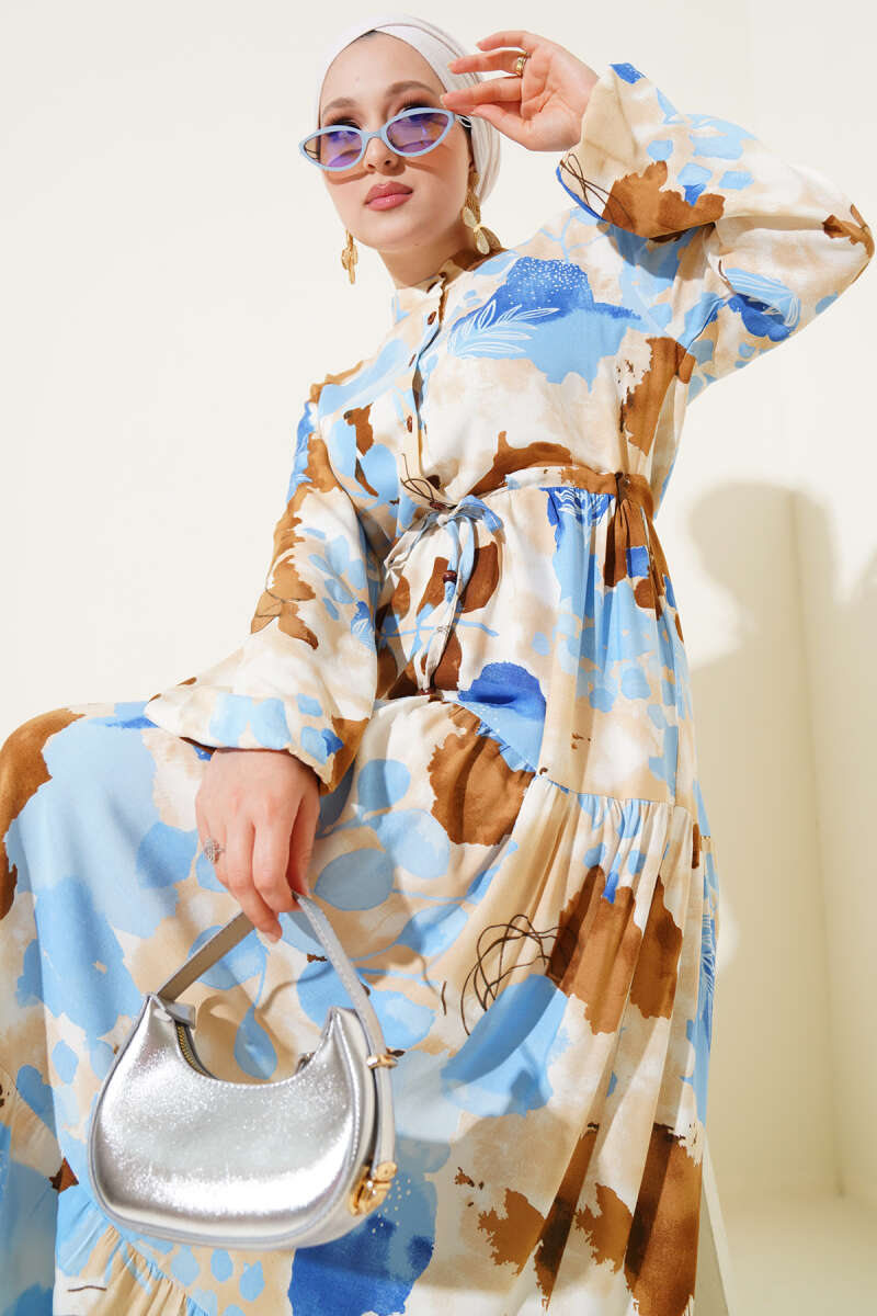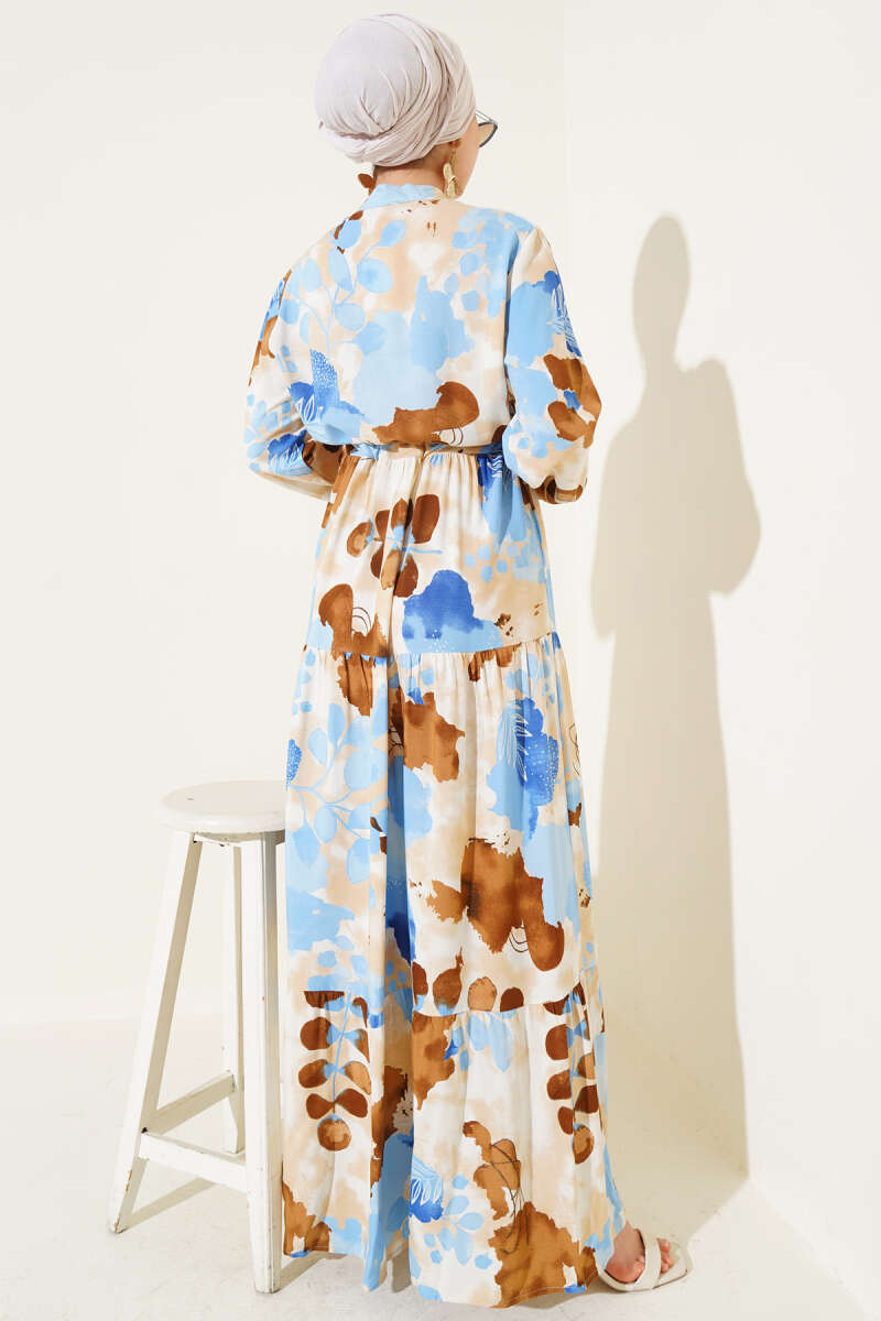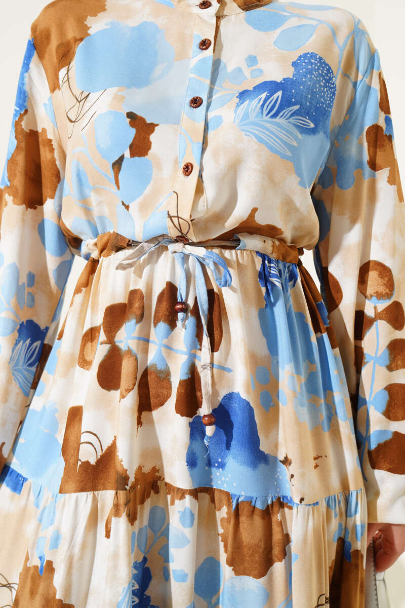 Bel Tünelli Düğmeli Desenli Elbise Mavi