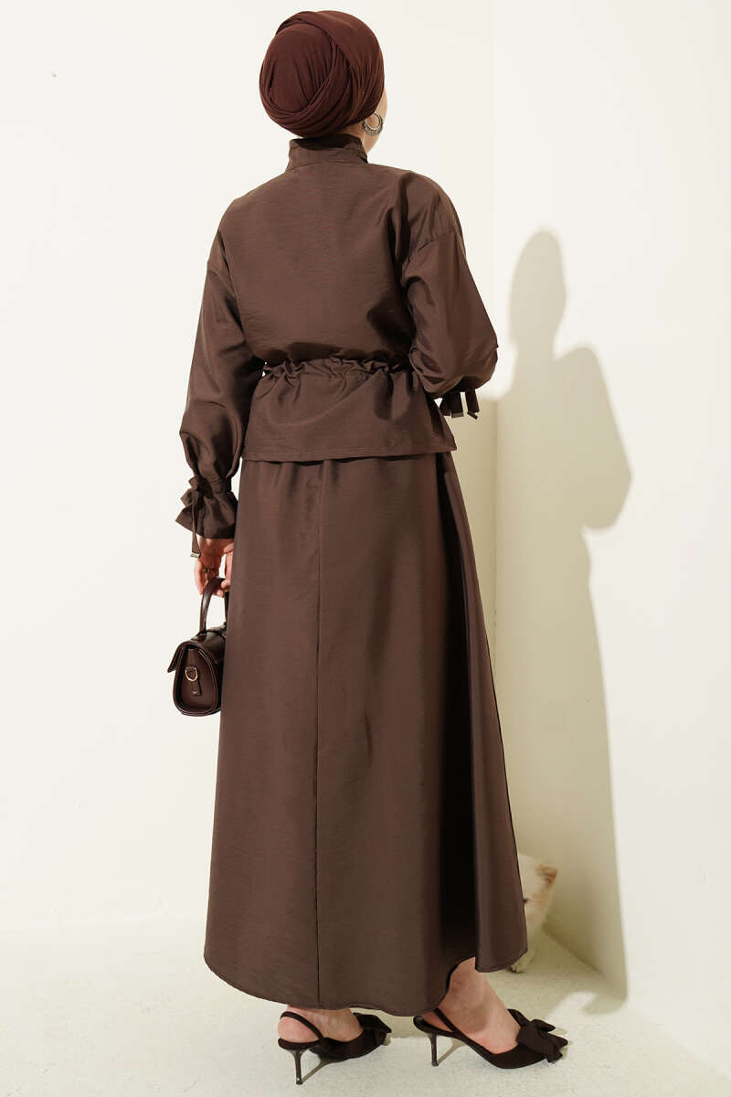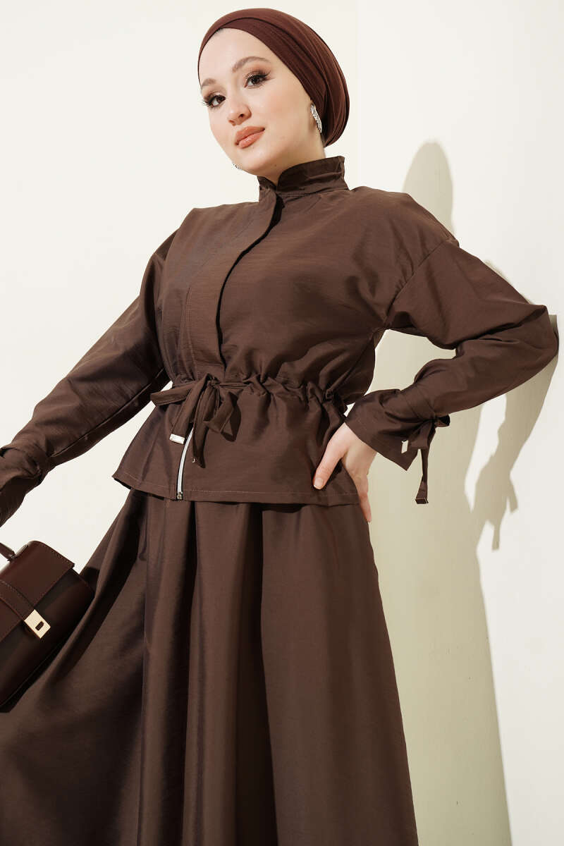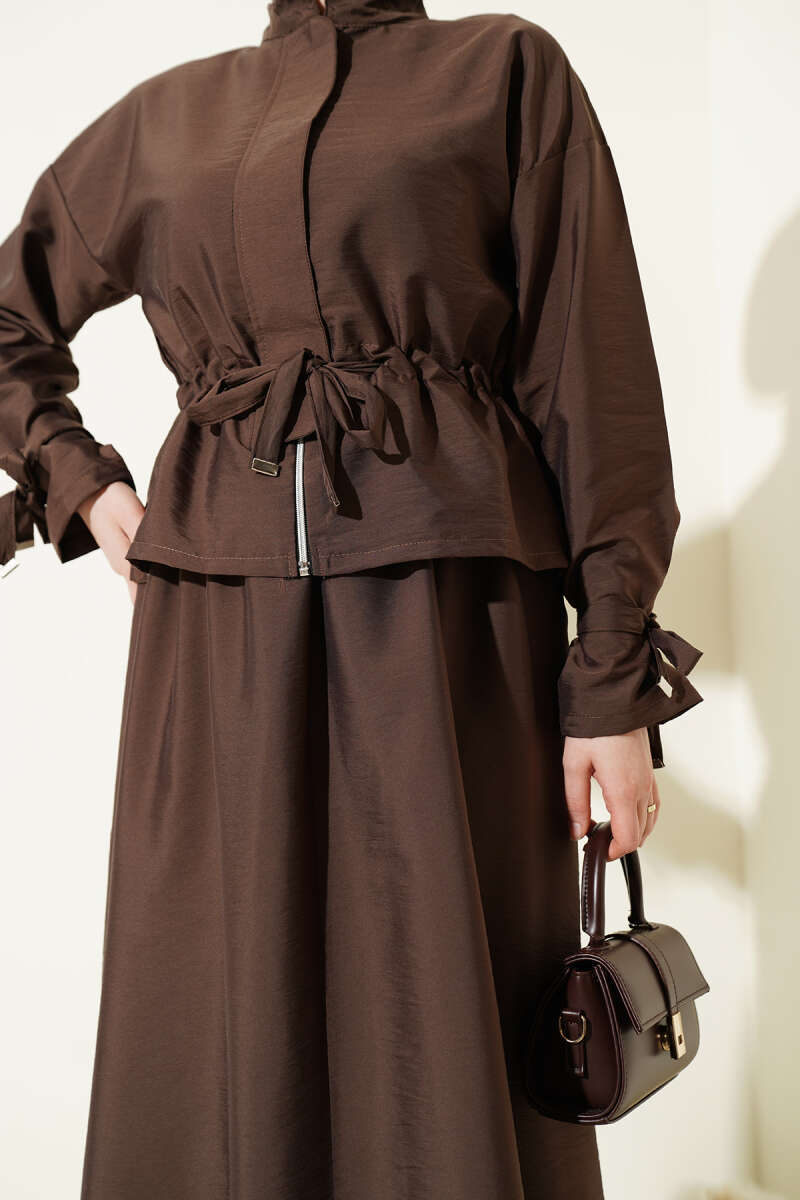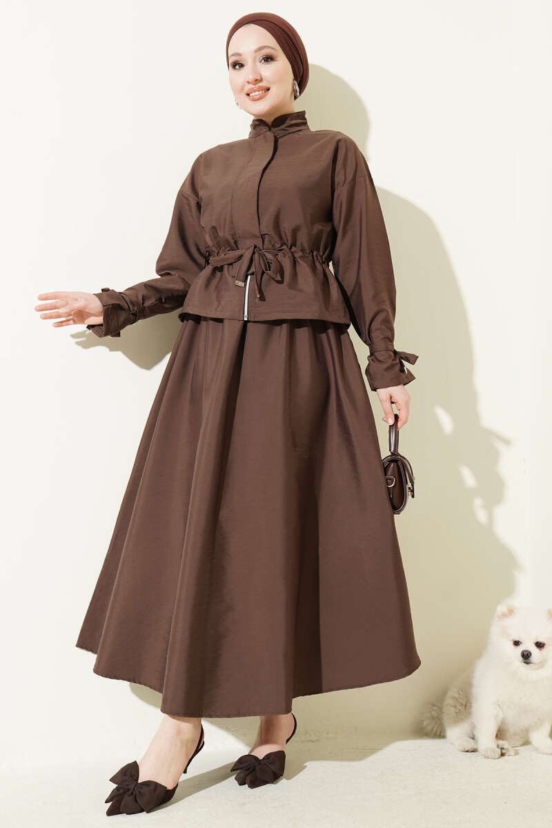 Bel Tünelli Fermuarlı Etekli İkili Takım Kahve