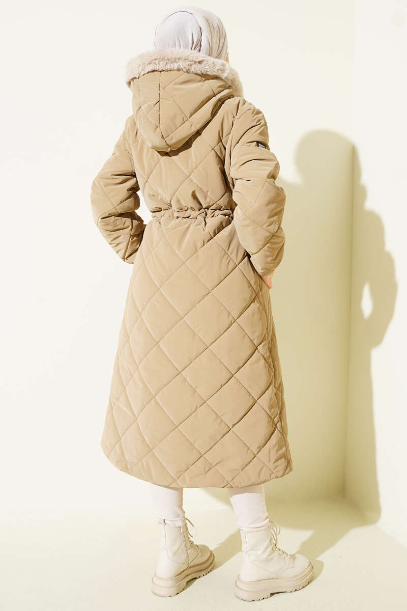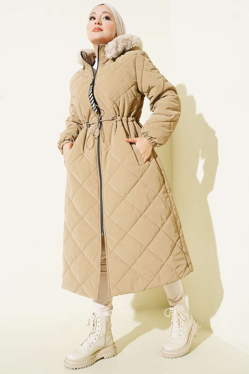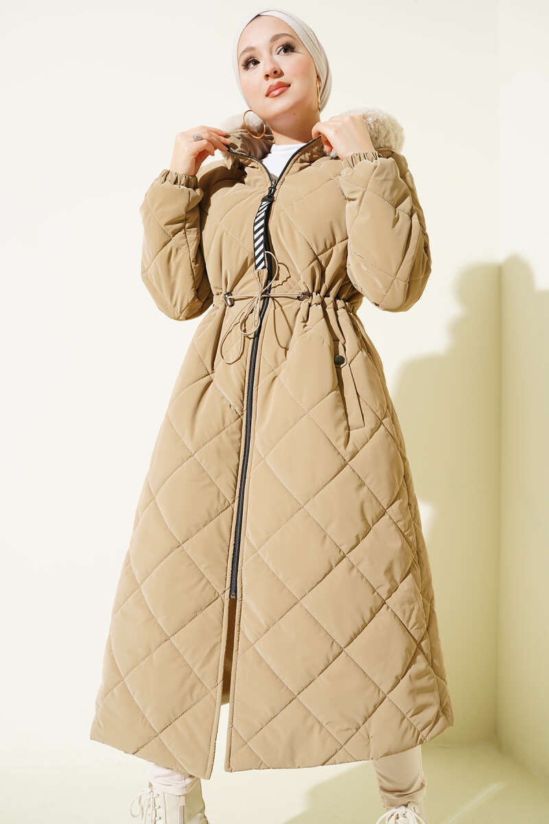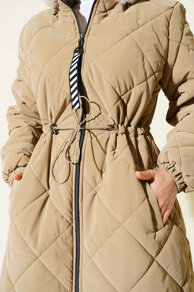 Zigzag Kapitone Kapüşonlu Şişme Mont Bej