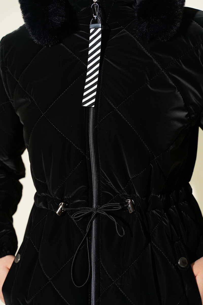 Kaşe Detaylı Yaka Kürklü Kapitone Mont Siyah