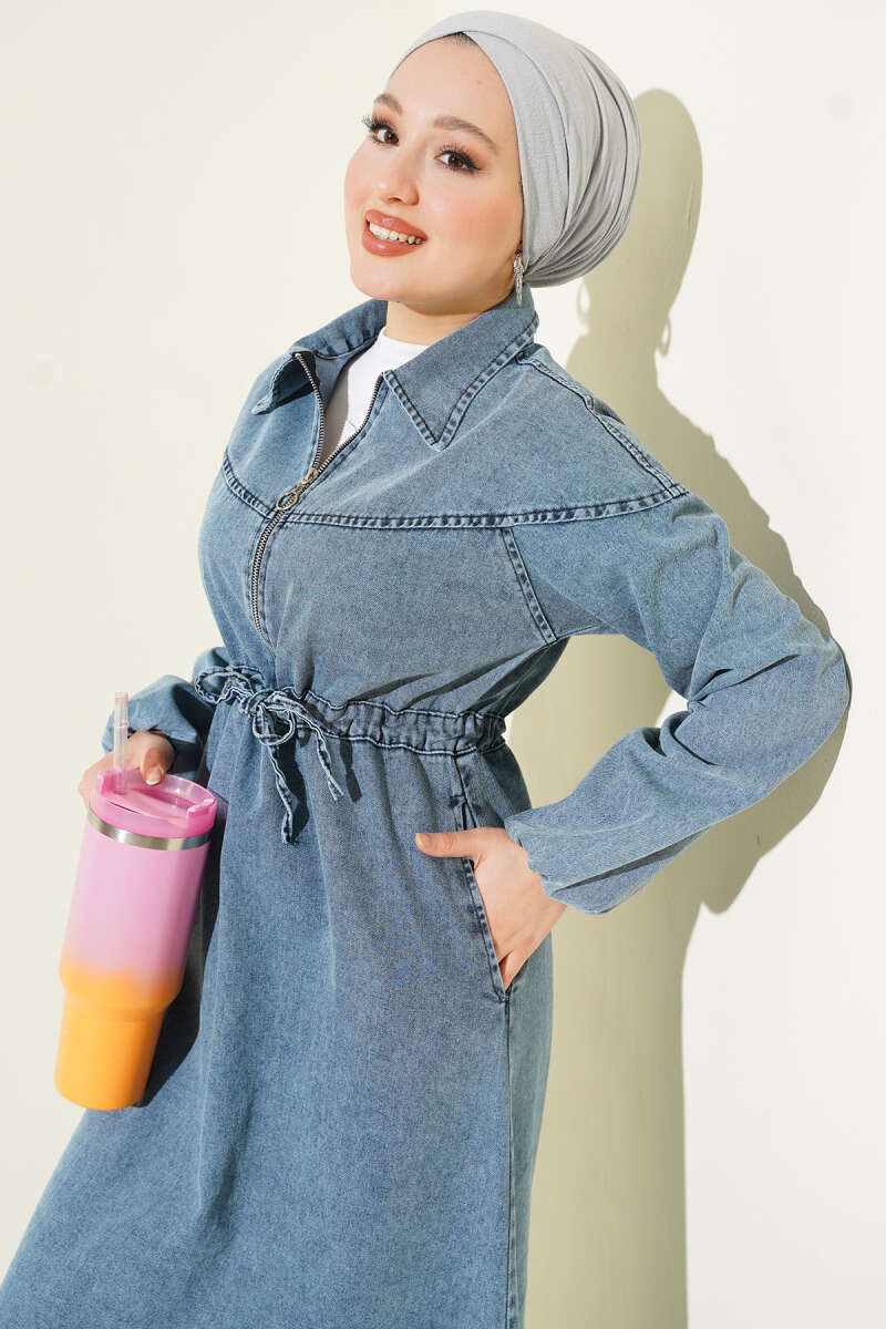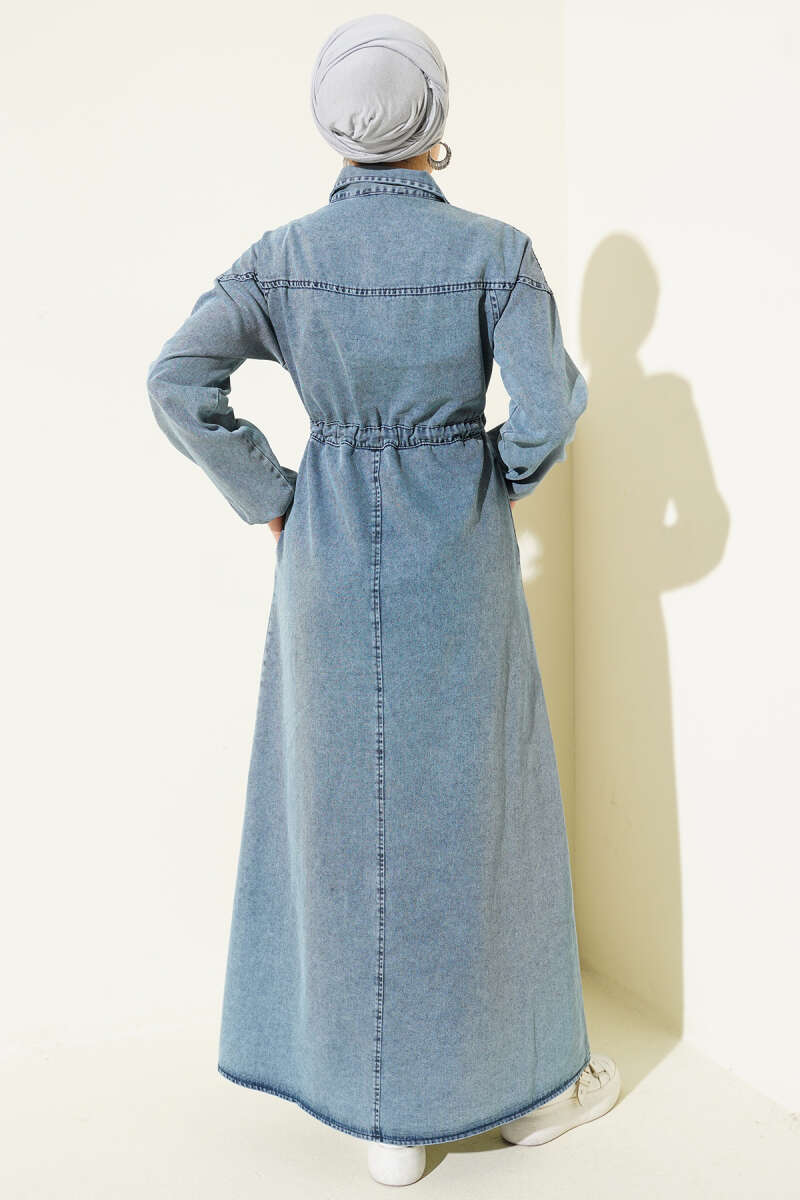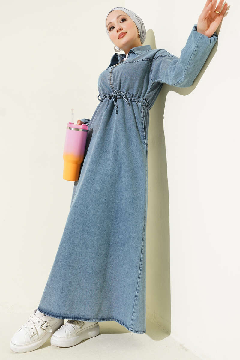 Bel Tünelli Gömlek Yaka Kot Elbise Lacivert