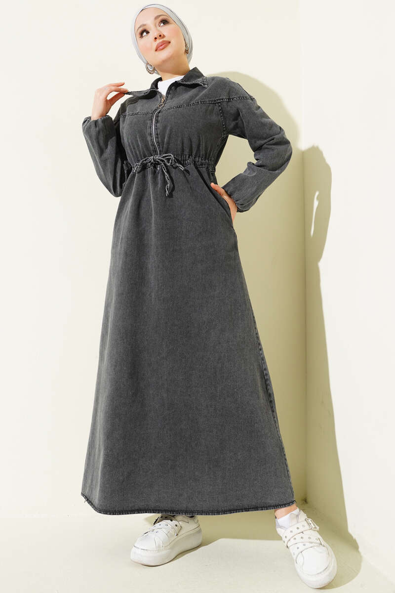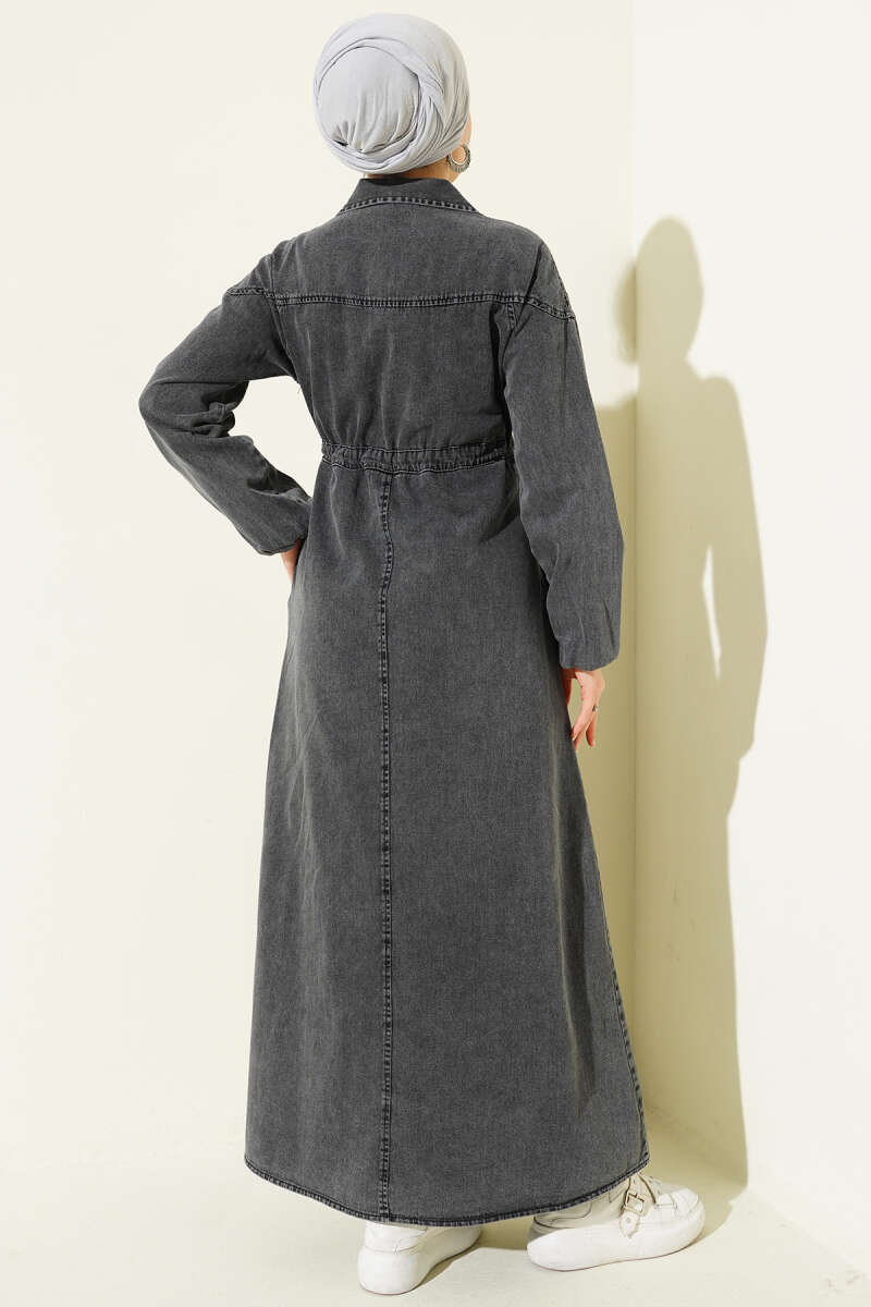 Bel Tünelli Gömlek Yaka Kot Elbise Siyah
