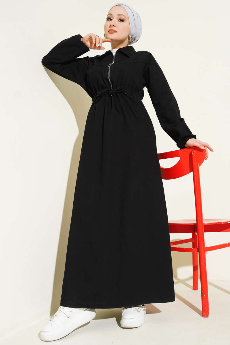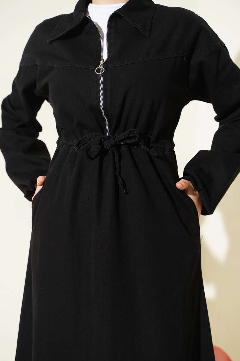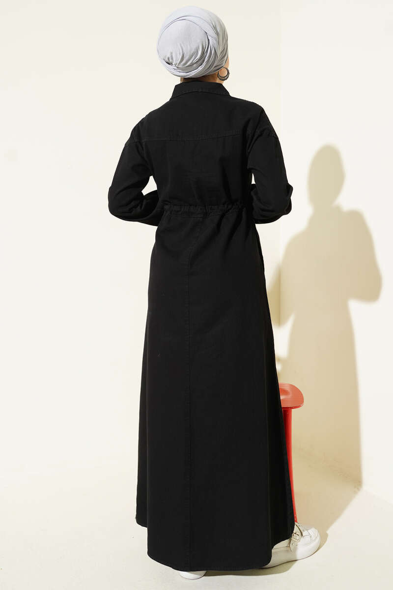 Bel Tünelli Gömlek Yaka Kot Elbise Füme