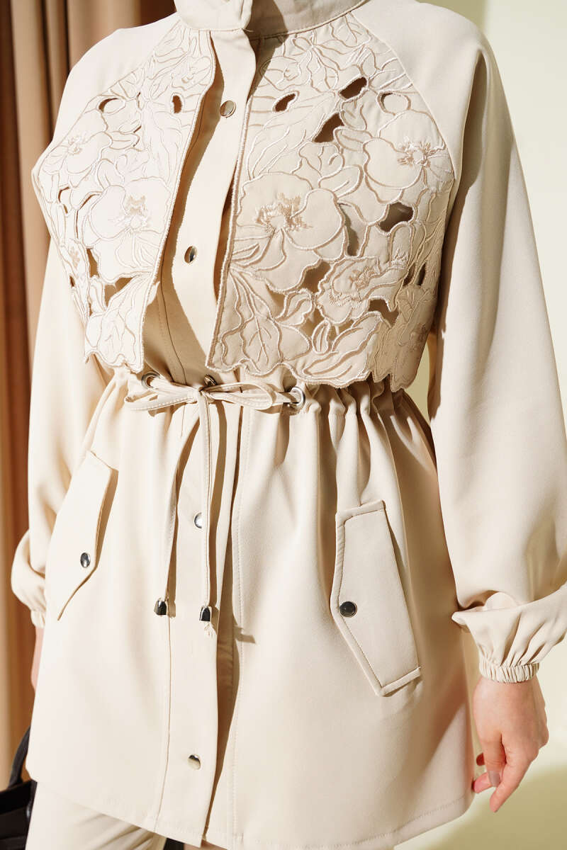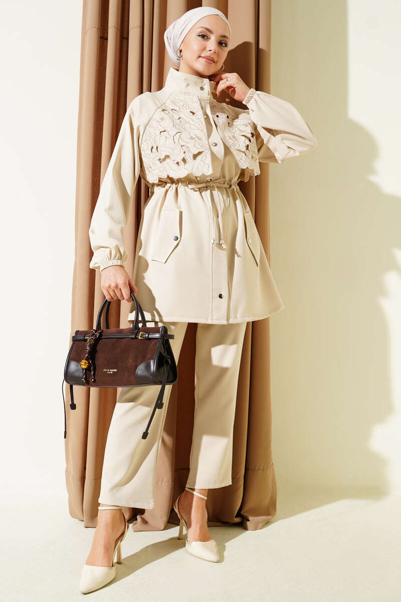 Bel Tünelli Güpür Parçalı İkili Takım Kahve