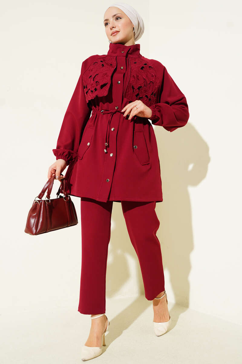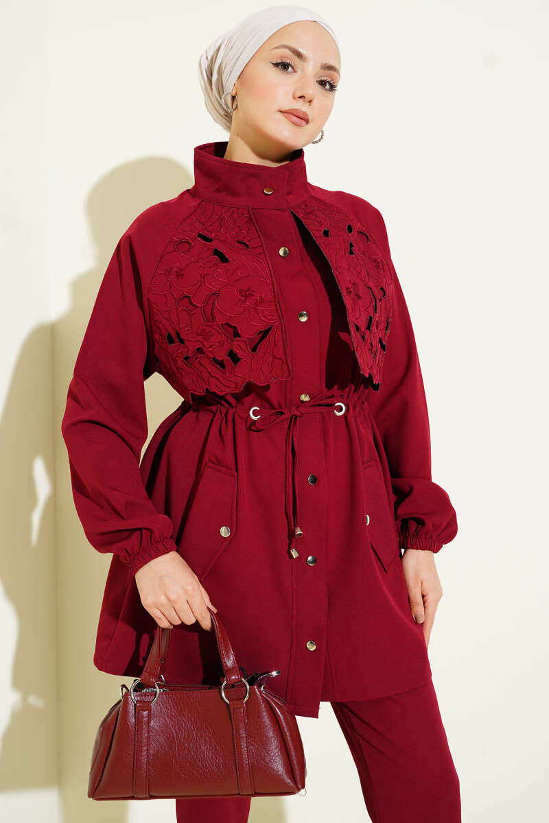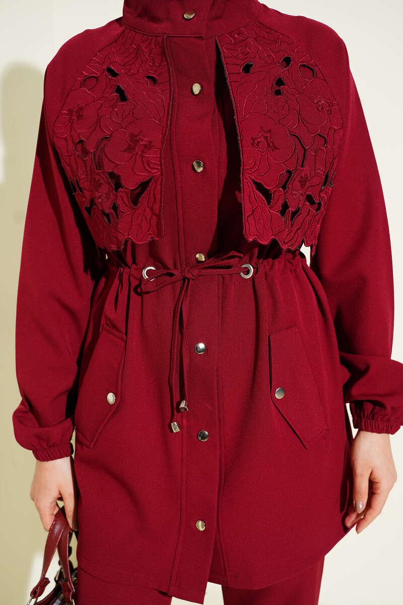 Omuz Apoletli Düğme Detaylı Kaşe Kaban Bordo