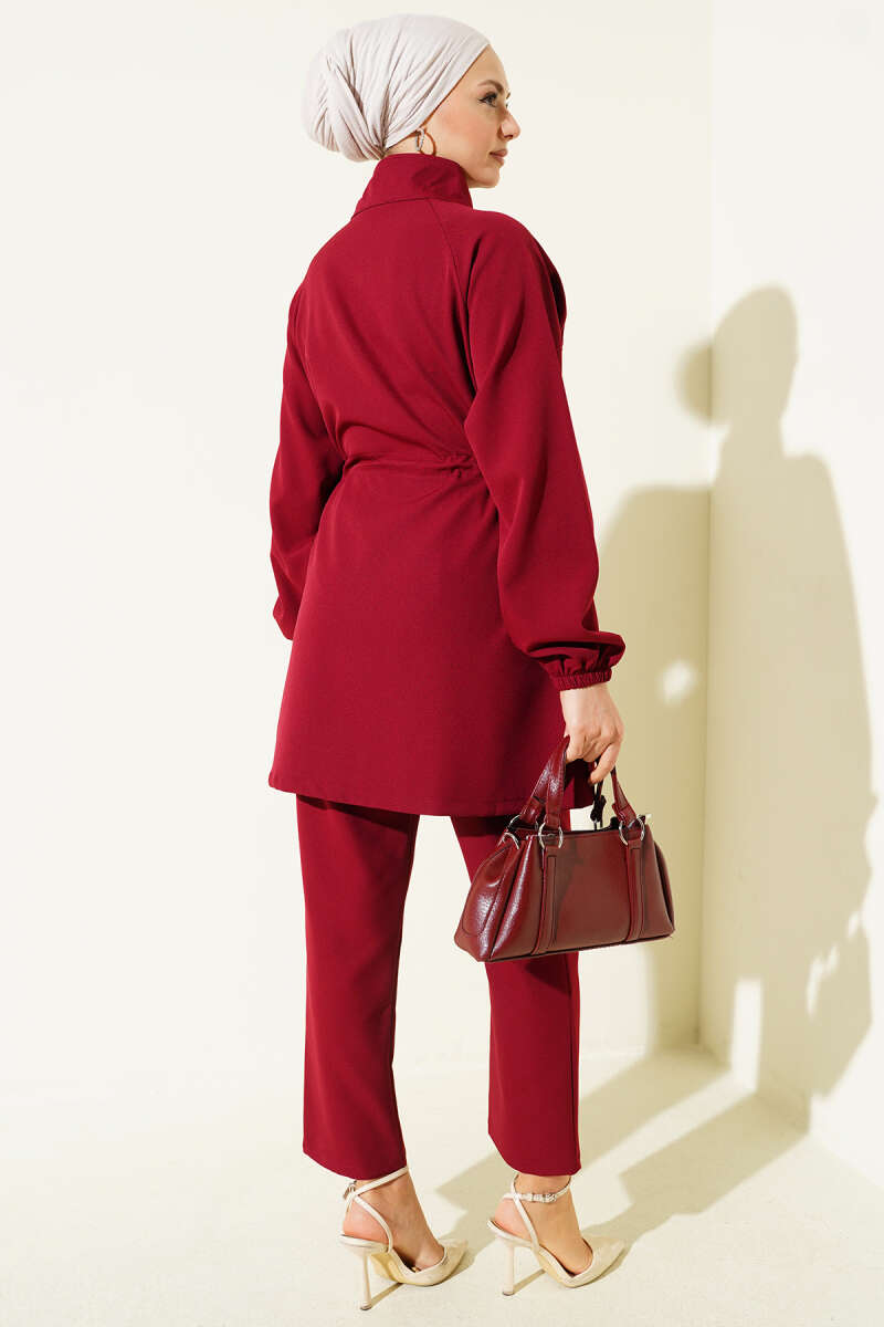 Düğmeli Fırfırlı Etekli İkili Takım Mürdüm