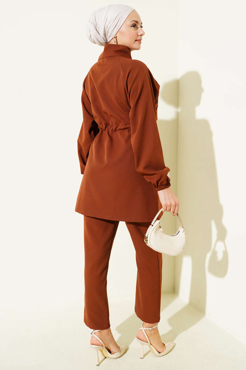Düğmeli Fırfırlı Etekli İkili Takım Acı Kahve