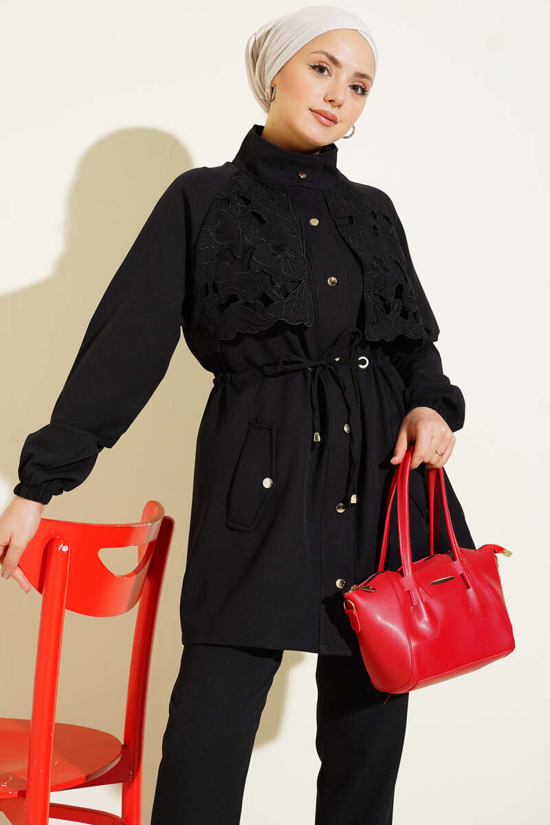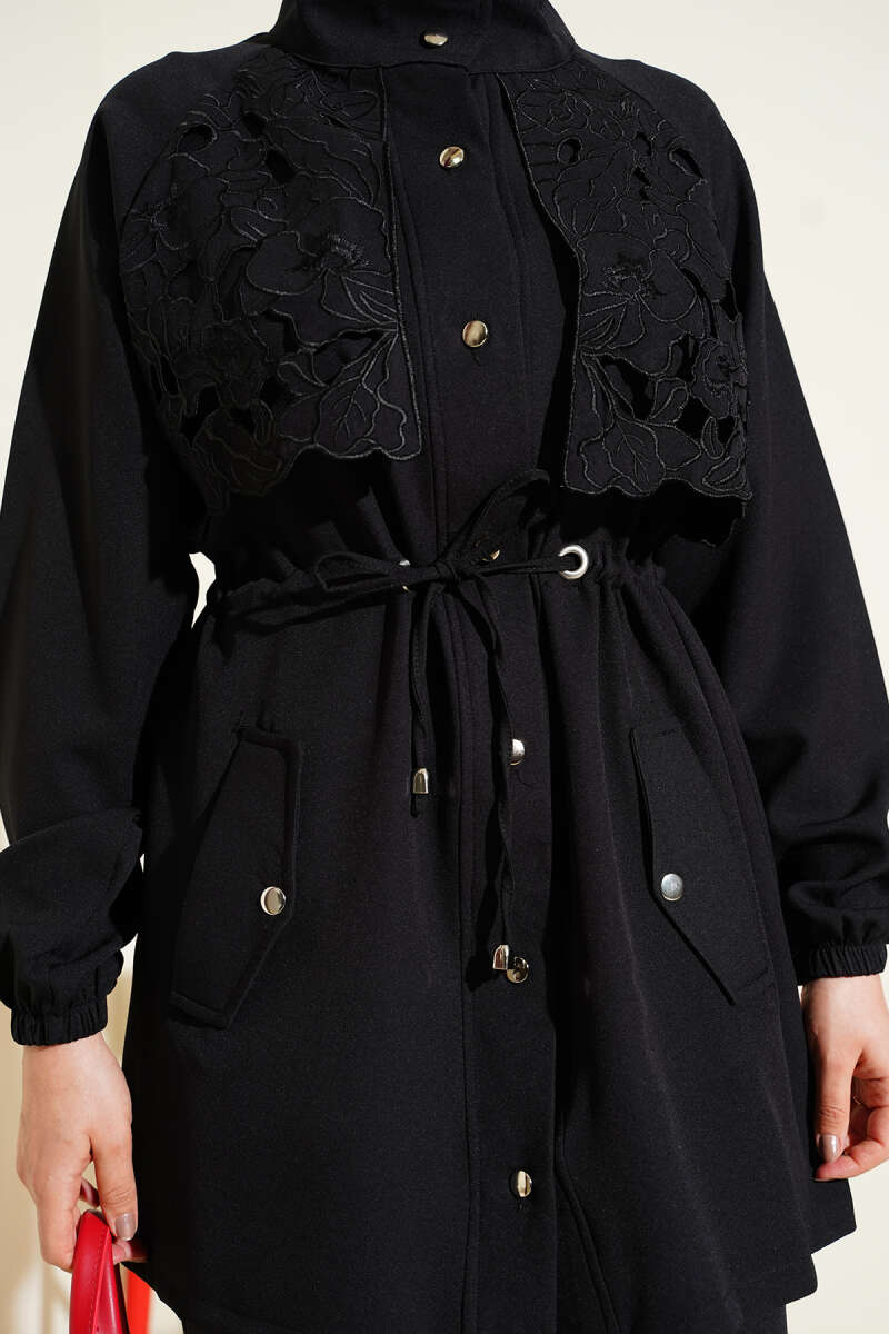 Düğmeli Kuşaklı Araboy Trençkot Siyah