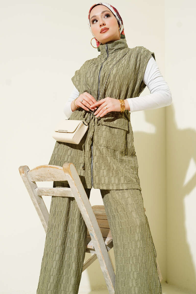 Bel Tünelli Kabartma Desen Yelekli Takım Çağla Yeşili