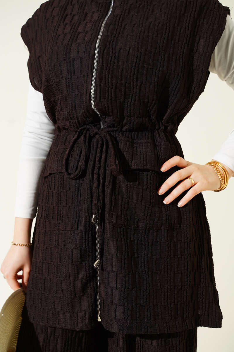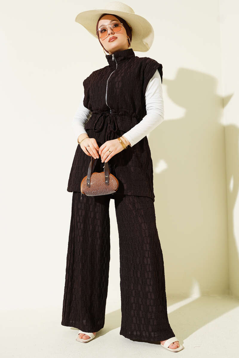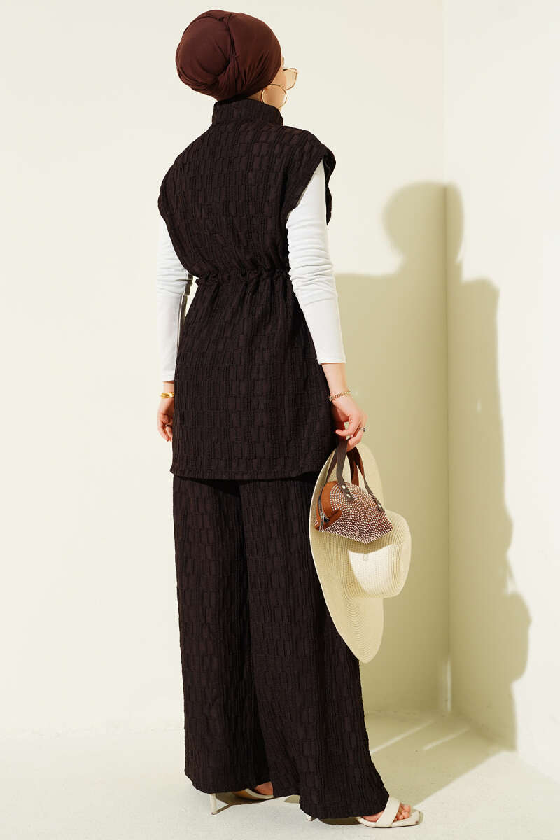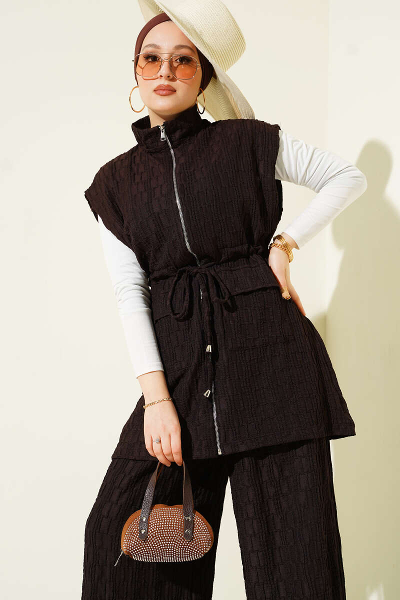 Taşlı Bel Tünelli Tunik İkili Takım Kahve
