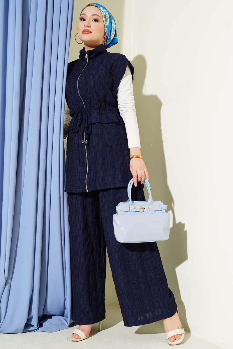 Taşlı Bel Tünelli Tunik İkili Takım Lacivert
