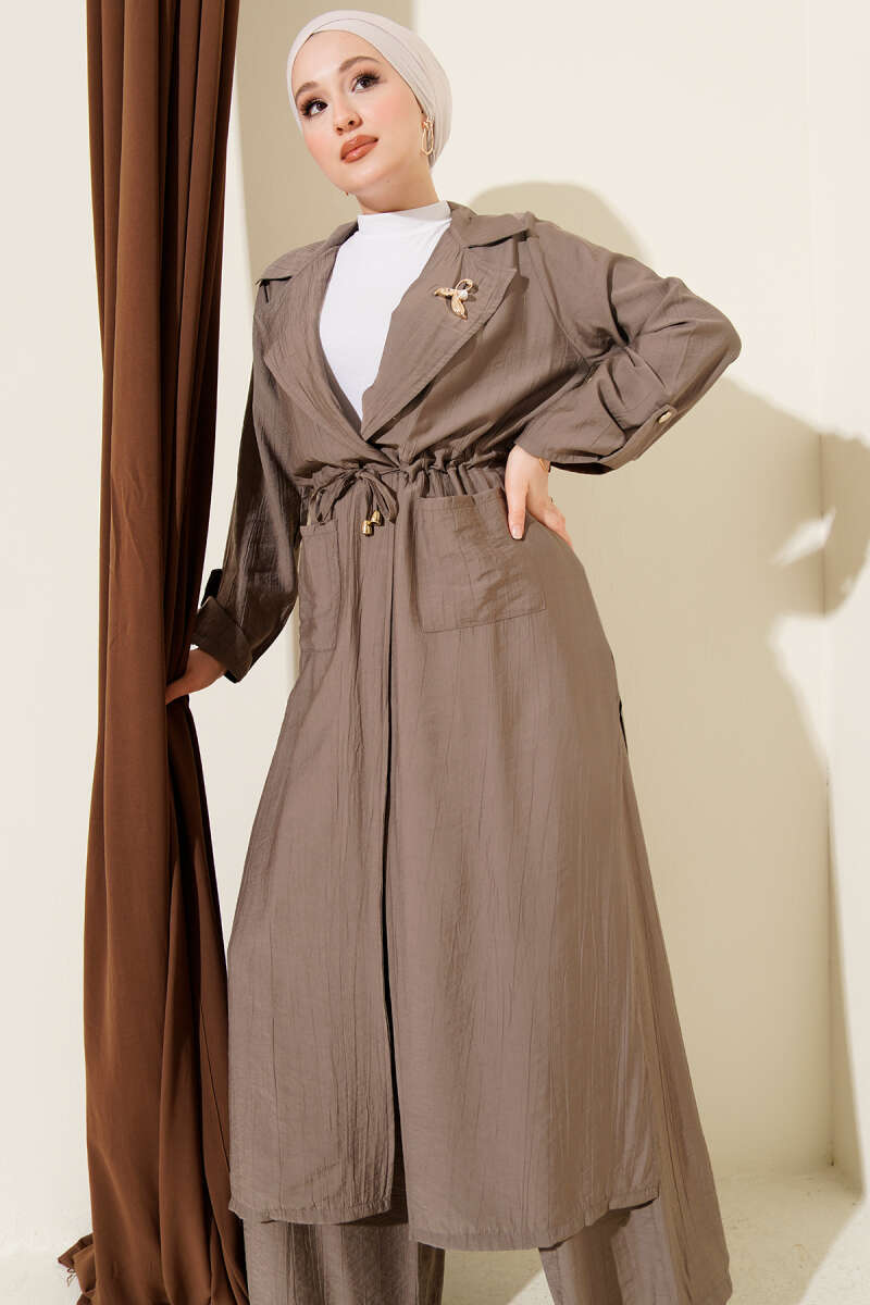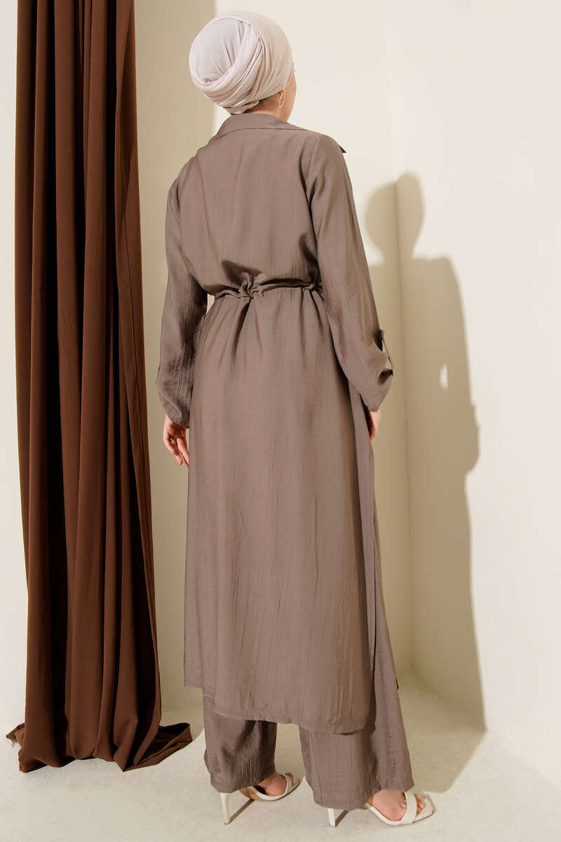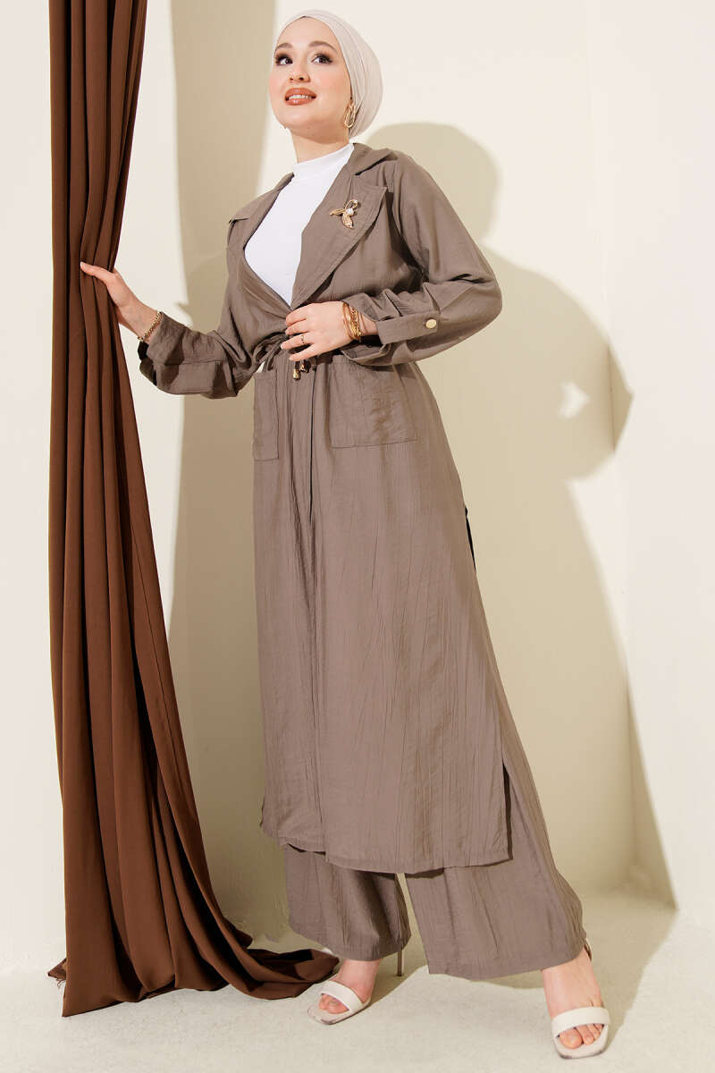 Denizci Yaka Dantelli Tunik İkili Takım Kahve