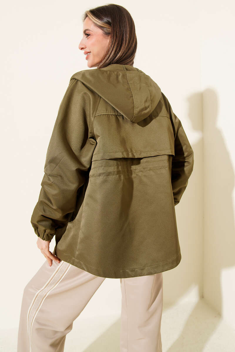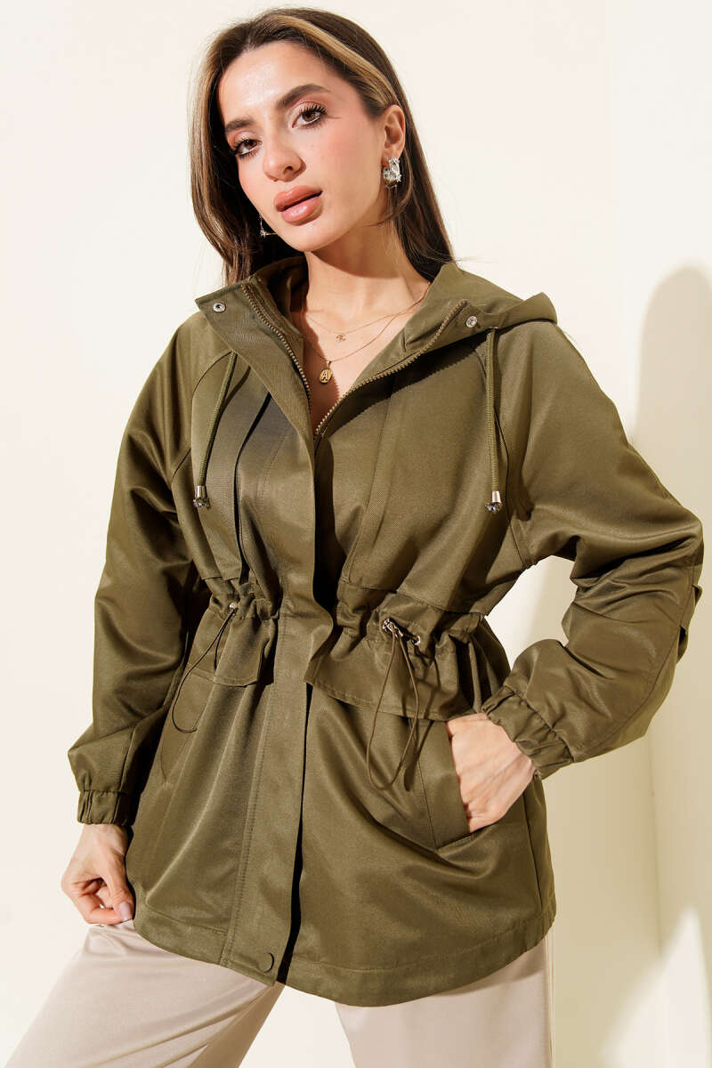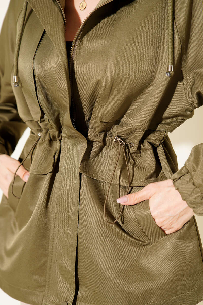 Bel Tünelli Kapüşonlu Cepli Trençkot Haki