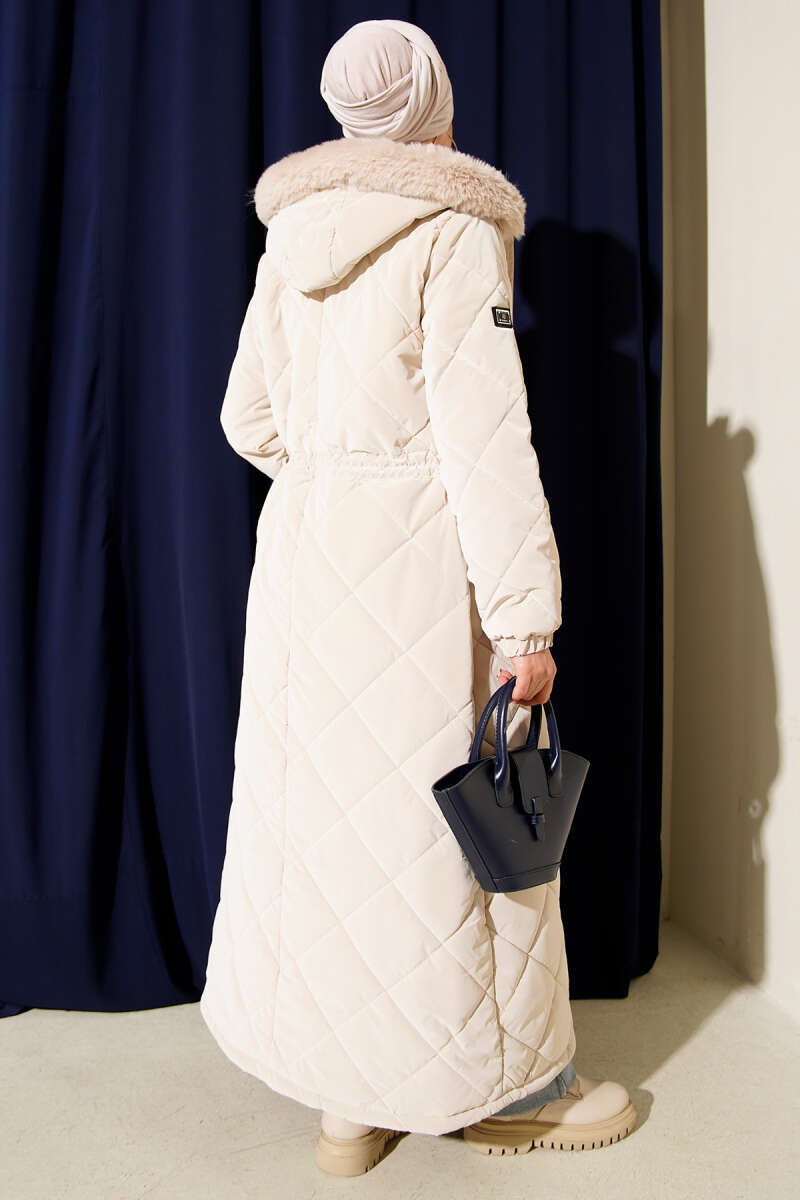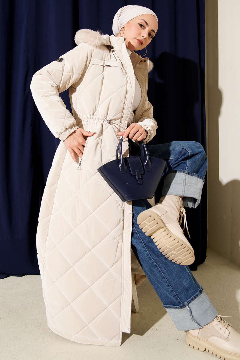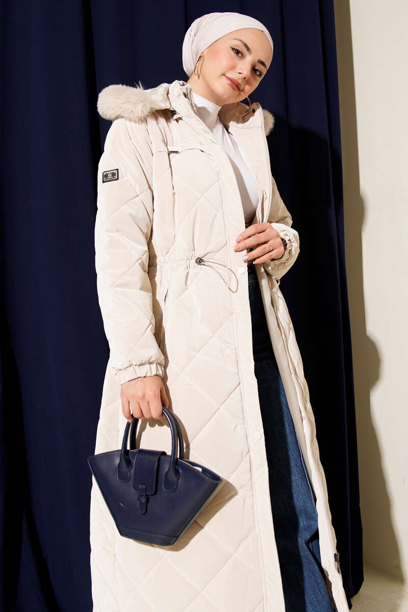 Kürk Detaylı Kapüşonlu Kapitone Mont Bej