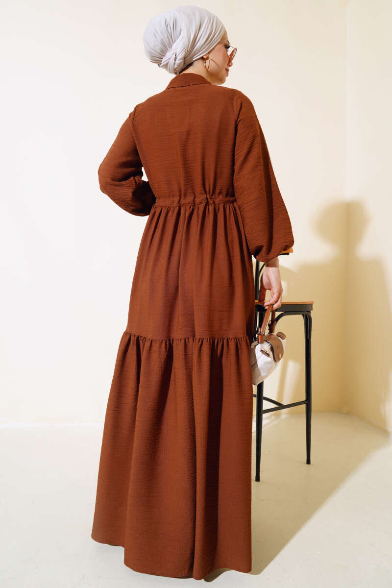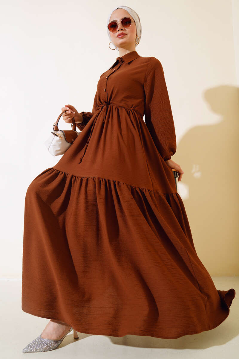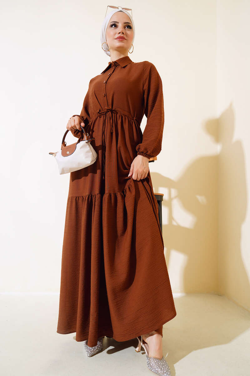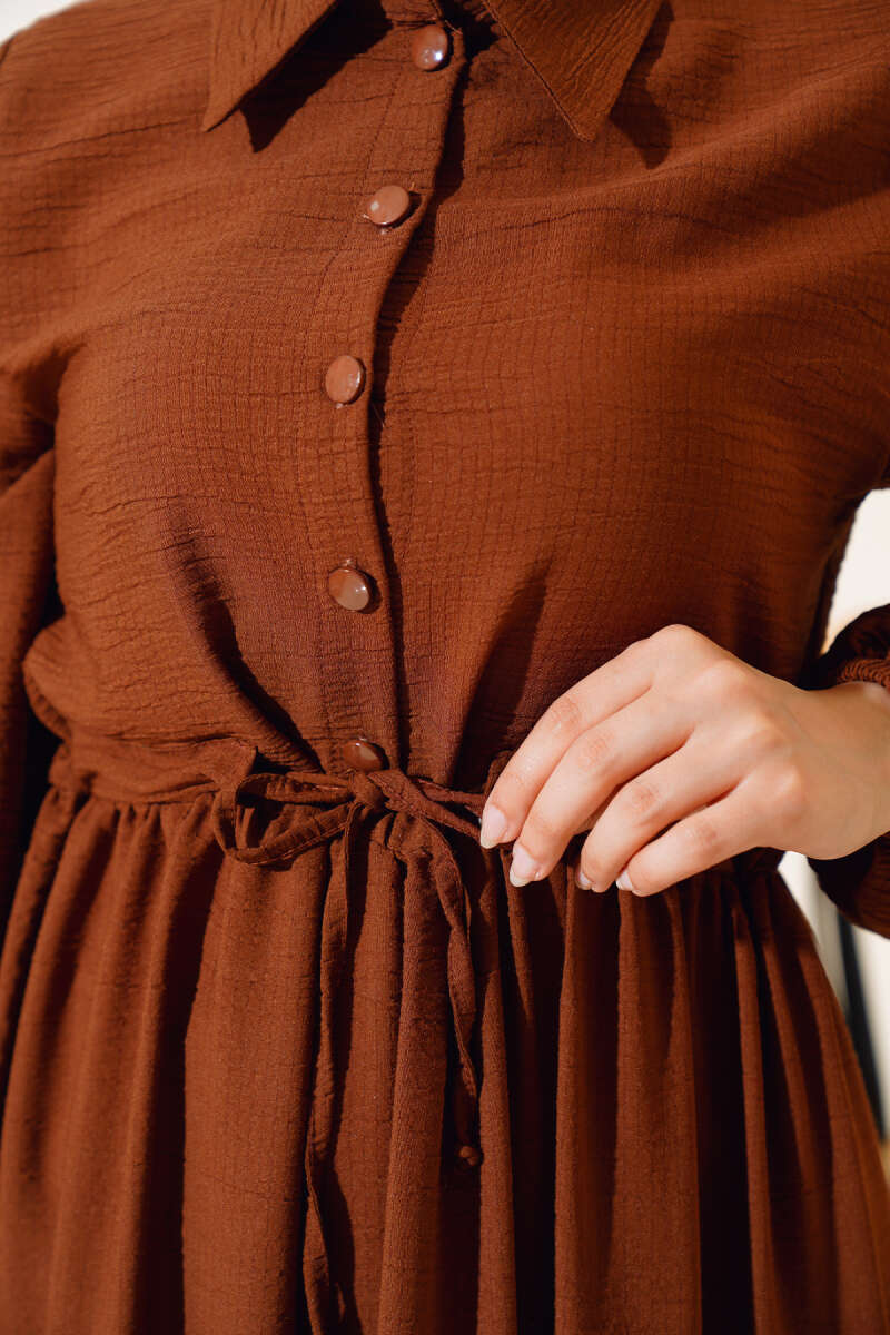 Kuşaklı Dik Fitilli Kaşe Elbise Kahve