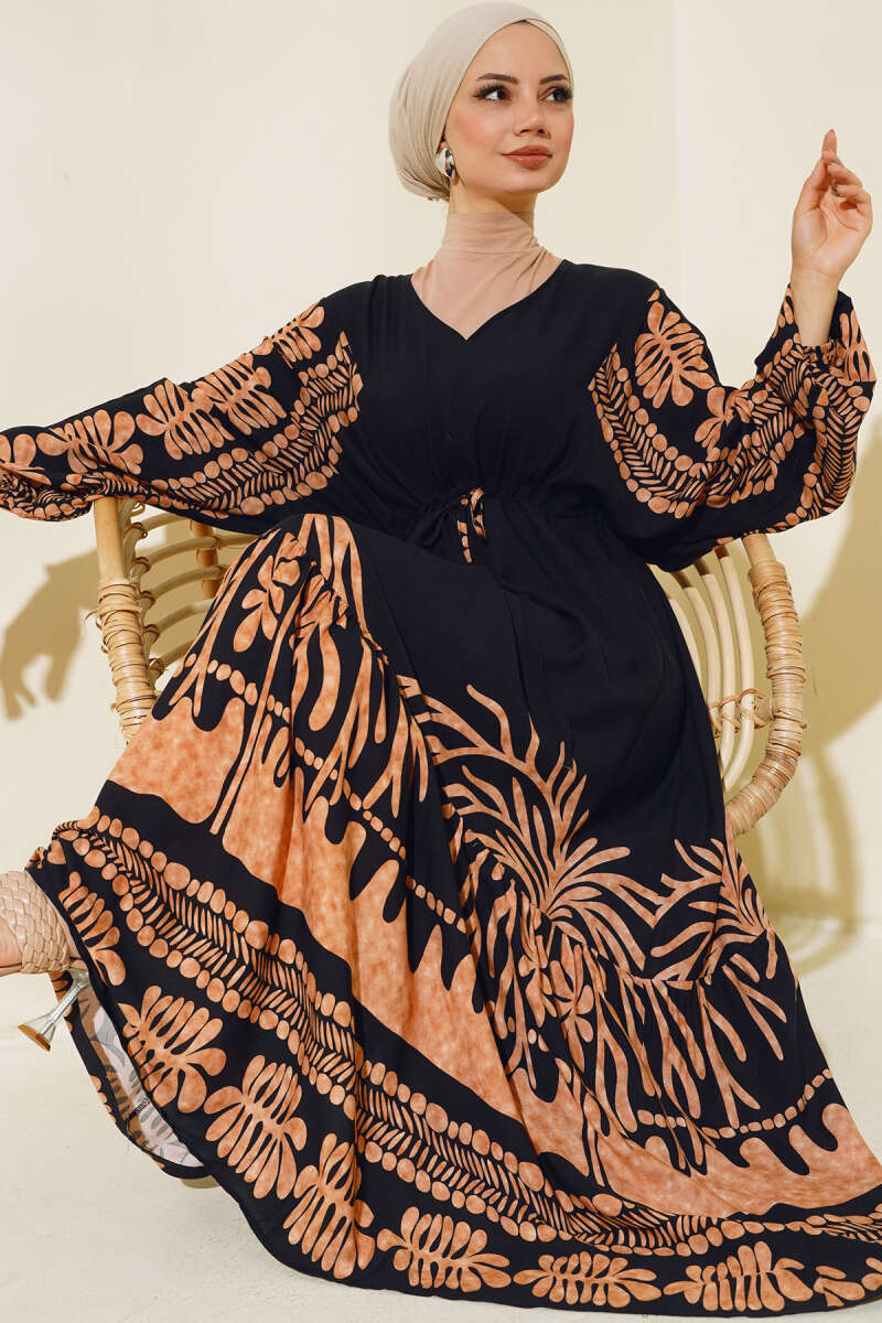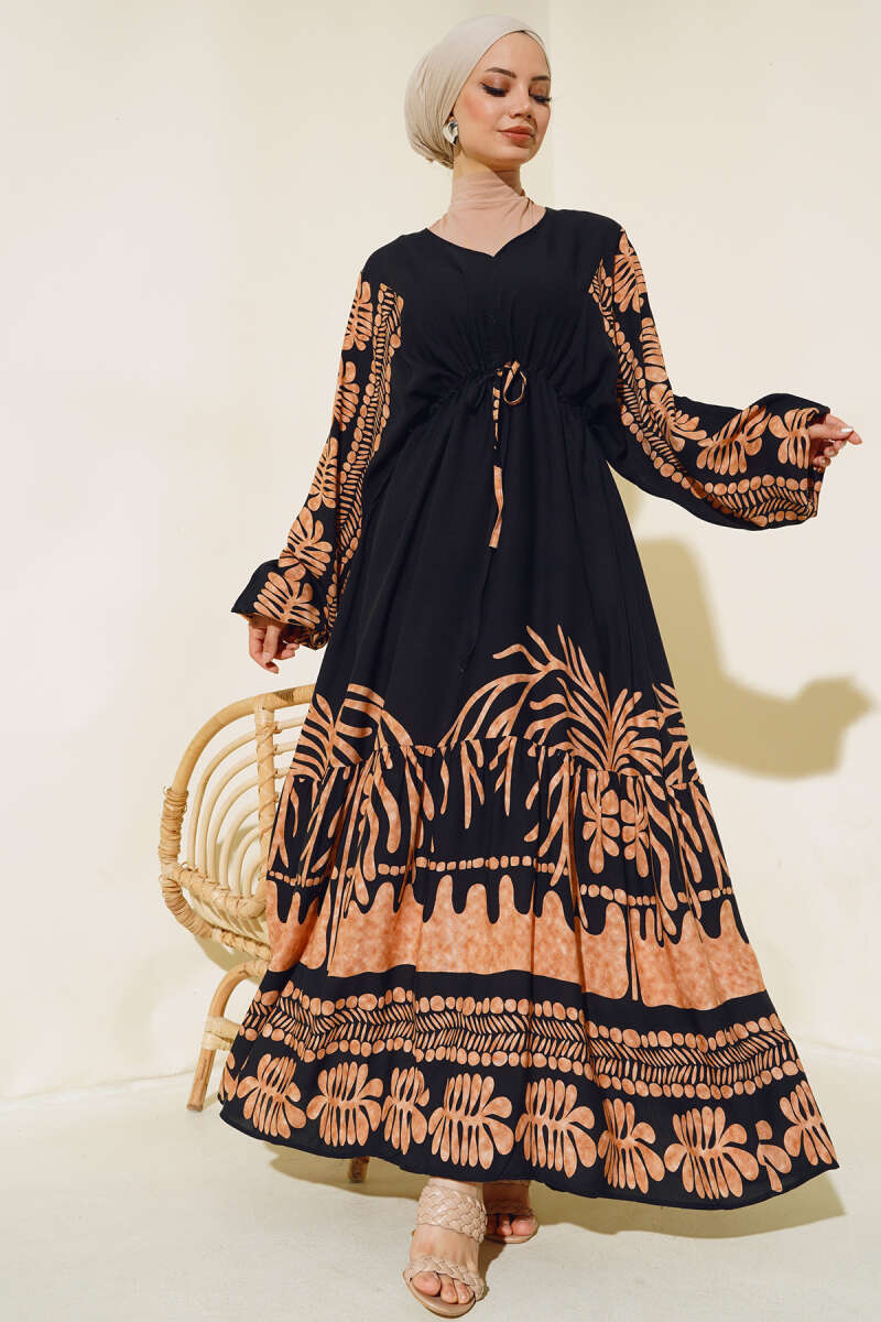 Kolları Fiyonk Detaylı Selanik Elbise Kahve