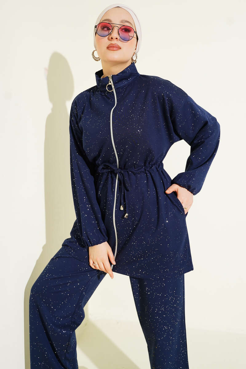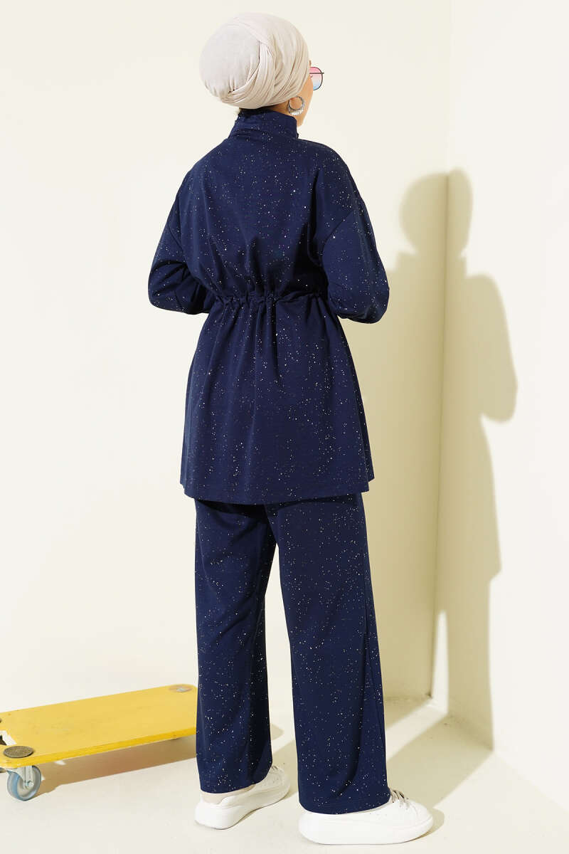 Sarmaşık Kabartmalı Etekli İkili Takım Lacivert
