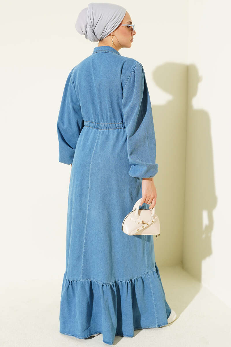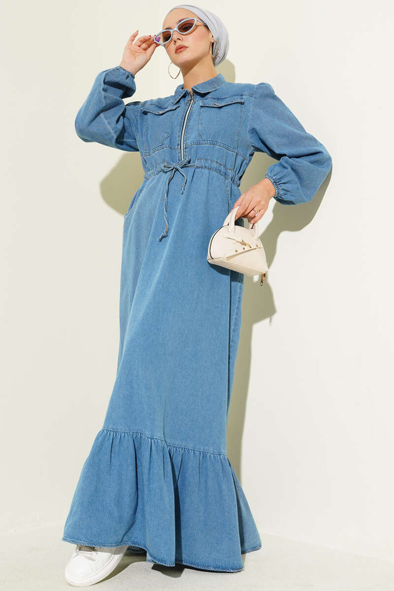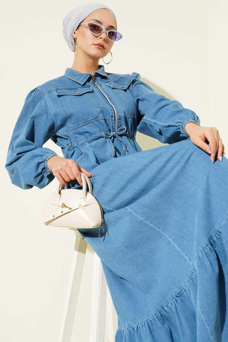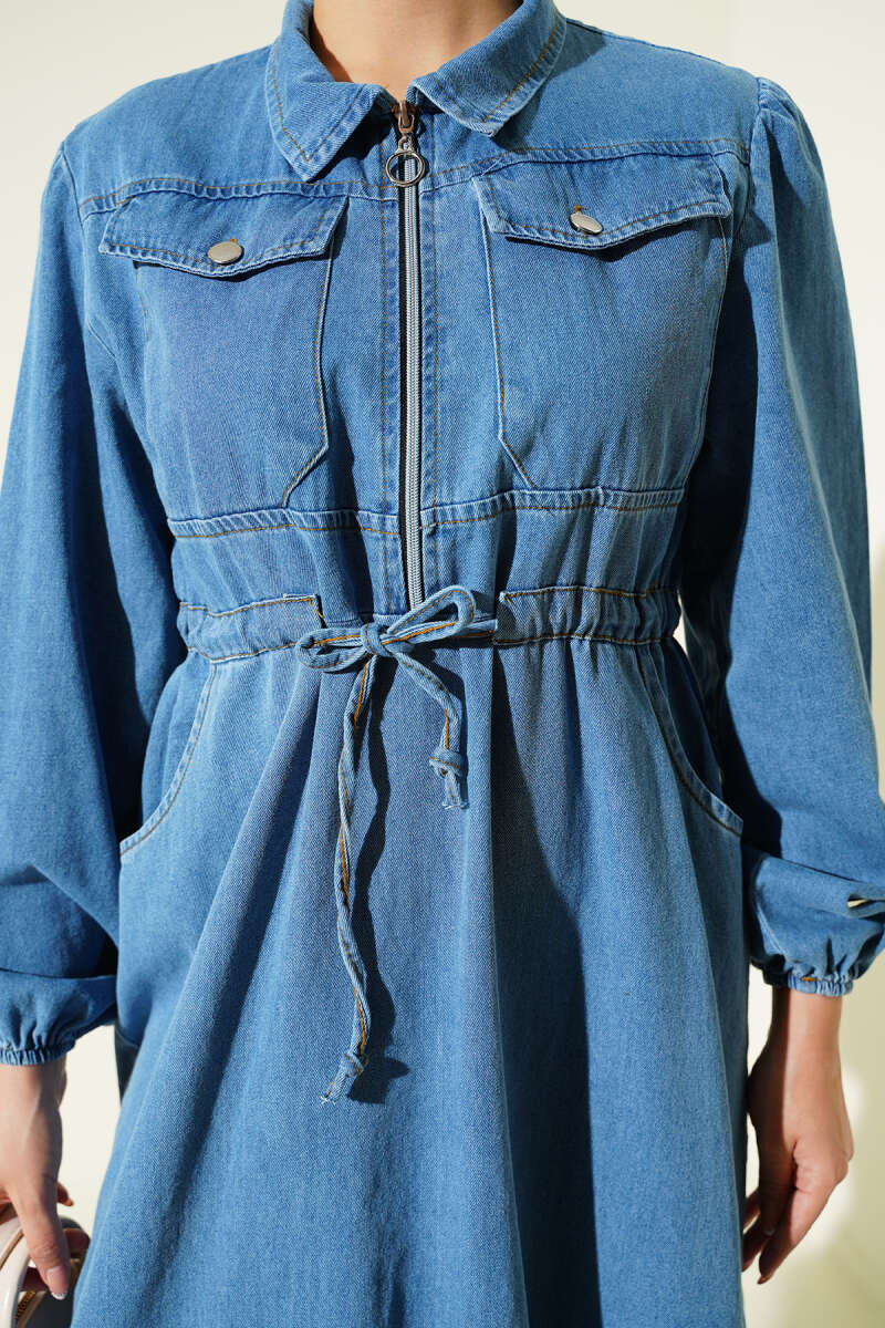 Bel Tünelli Yaka Fermuarlı Kot Elbise Mavi