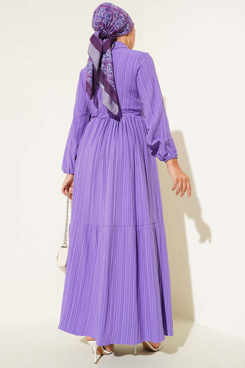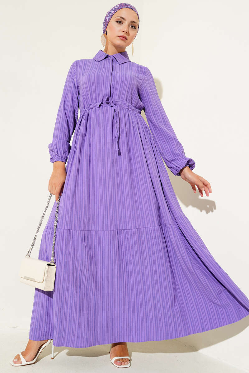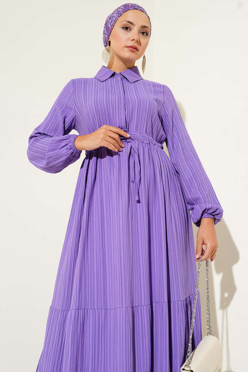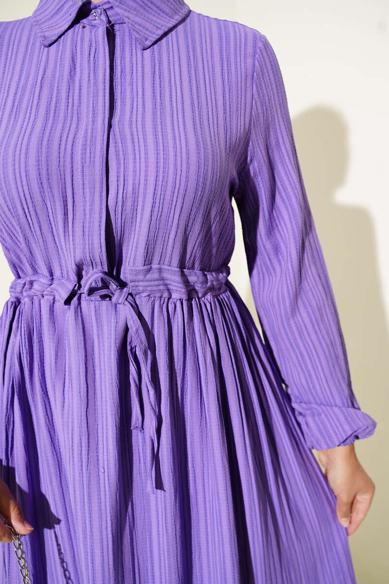 Bel Tünelli Yarım Gizli Düğmeli Elbise Lila