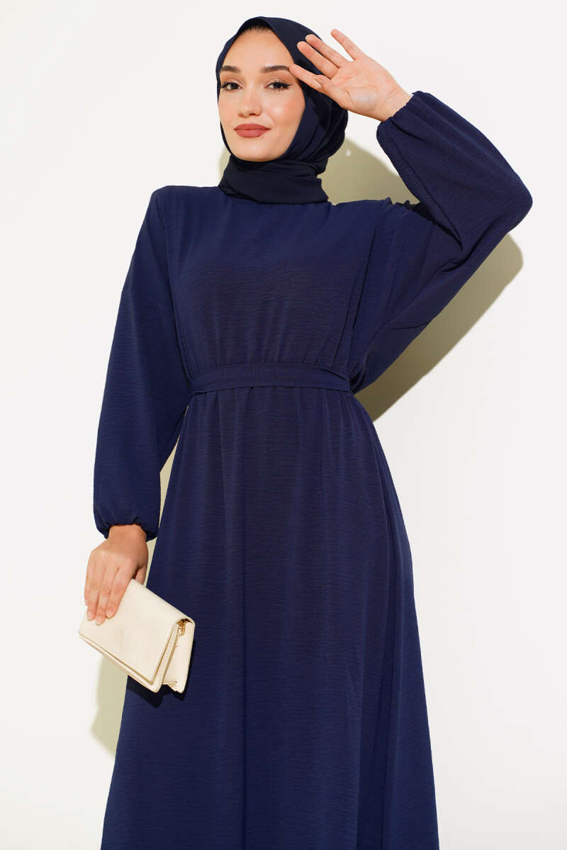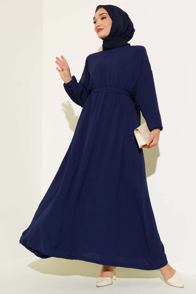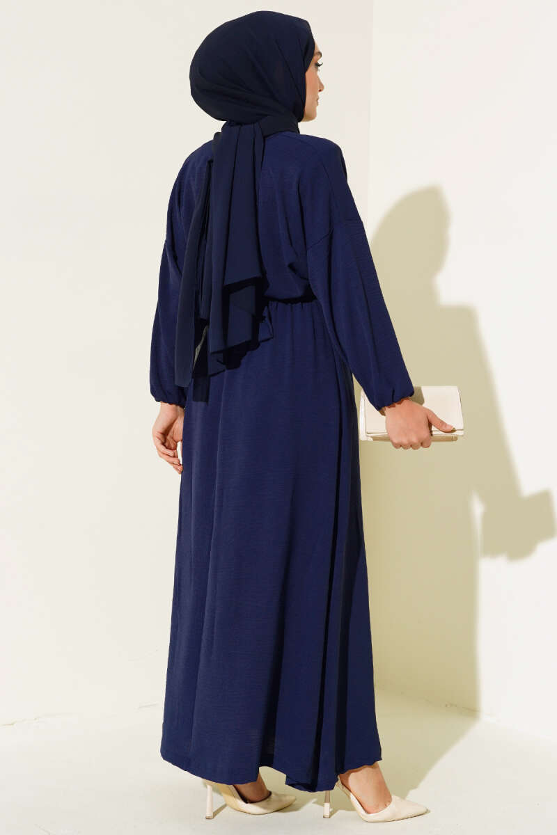 Yaka ve Kol Taşlı Saten Elbise Lacivert