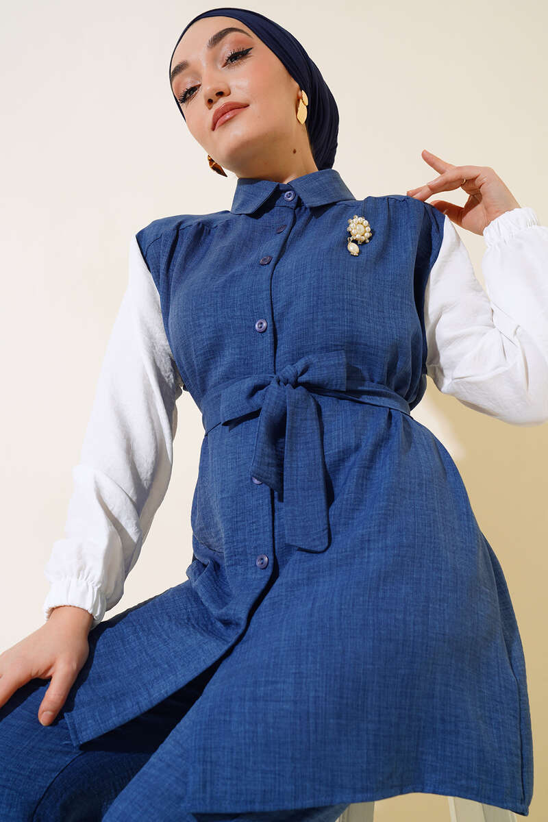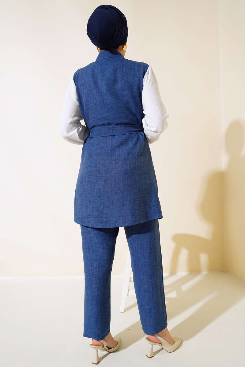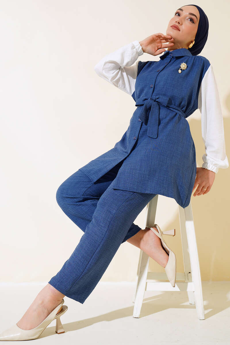 Belden Kuşaklı Garnili İkili Takım İndigo