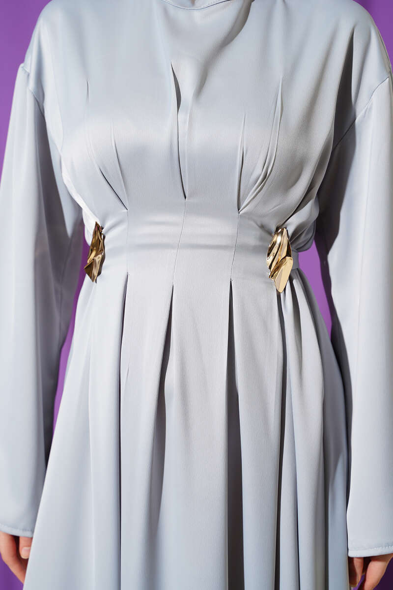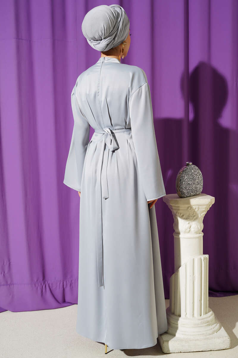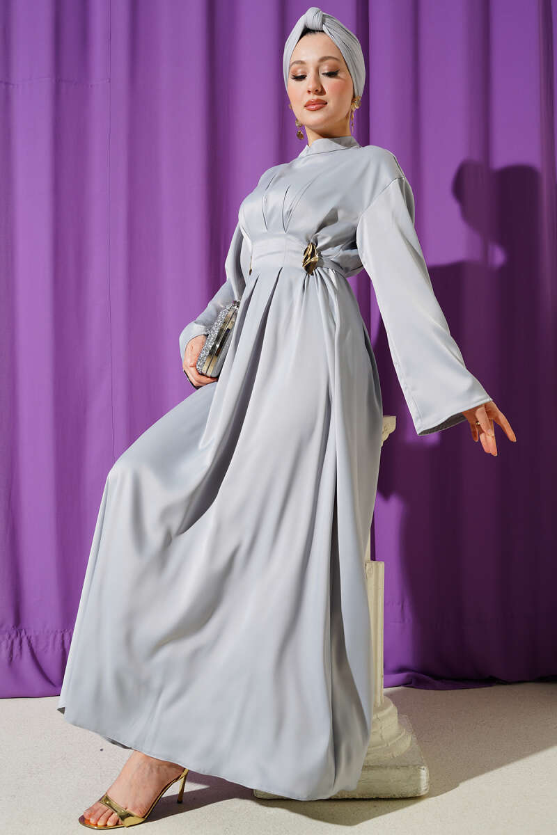Beli Aksesuarlı Bağlamalı Abiye Elbise Gri