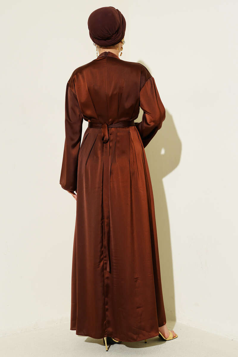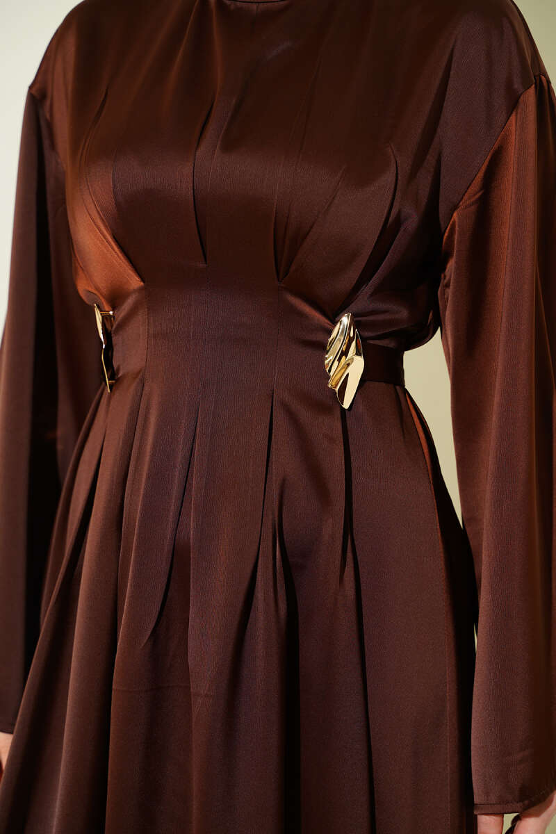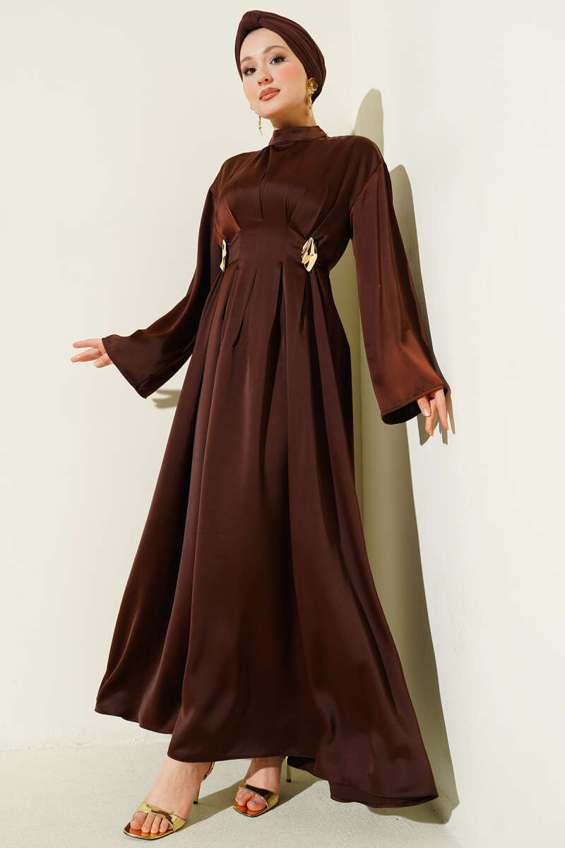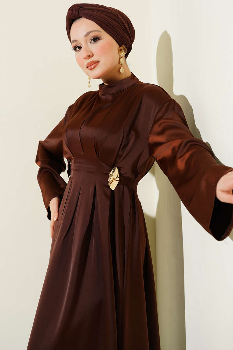 Beli Aksesuarlı Bağlamalı Abiye Elbise Kahve