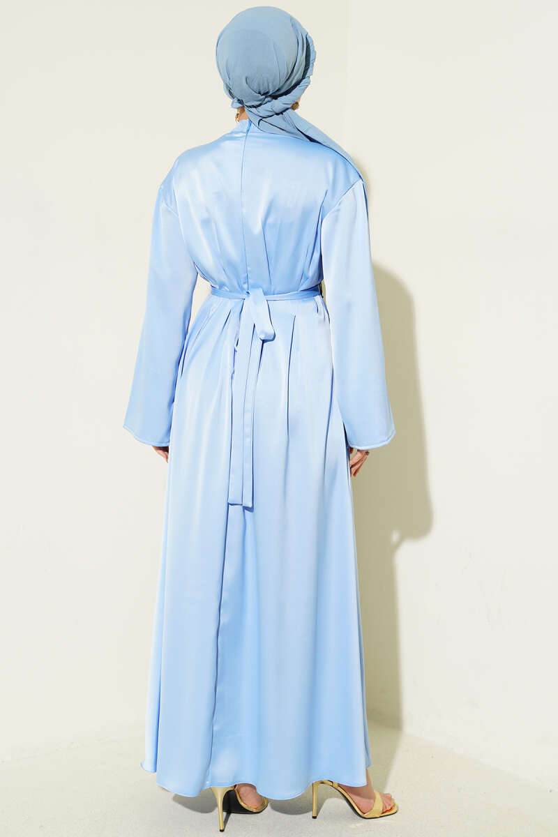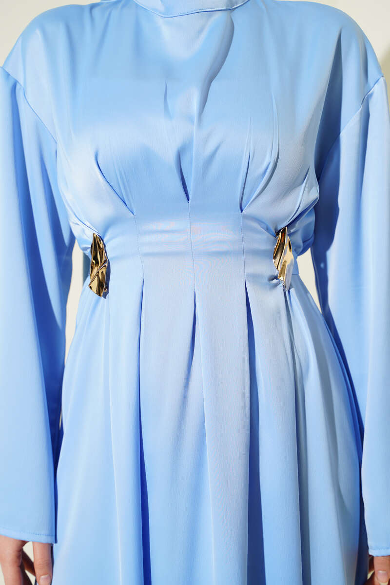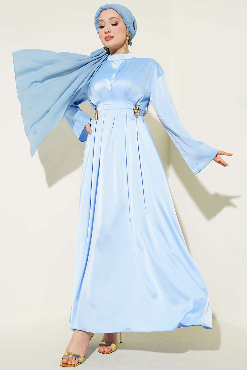 Beli Aksesuarlı Bağlamalı Abiye Elbise Mavi
