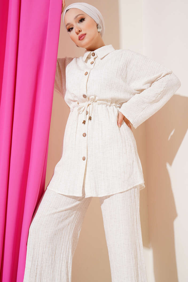 Beli Bağcıklı Önü Tahta Düğmeli İkili Takım Bej